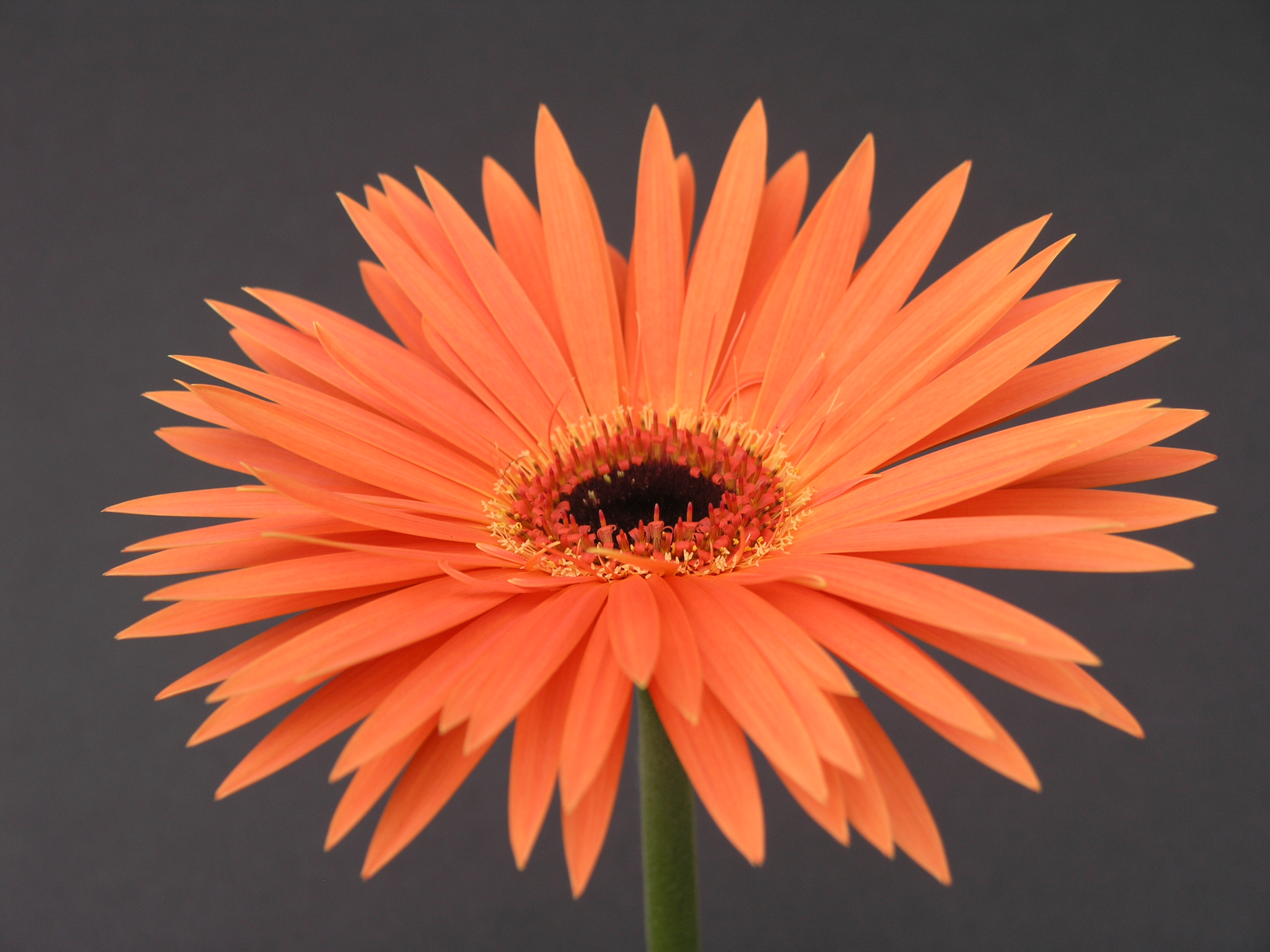 Morfoloģija. Ziedkopas oranždzeltenas, klajas – diametrā 13,0 -14,0 cm. Mēlziedi plati, smaili ar zobiņiem. Ziedkopas centrs – zaļgans. Ziedkāti gari, 60 – 70 cm, noturīgi. Pirmajā audzēšanas gadā veido 1 – 2 dzinumus.