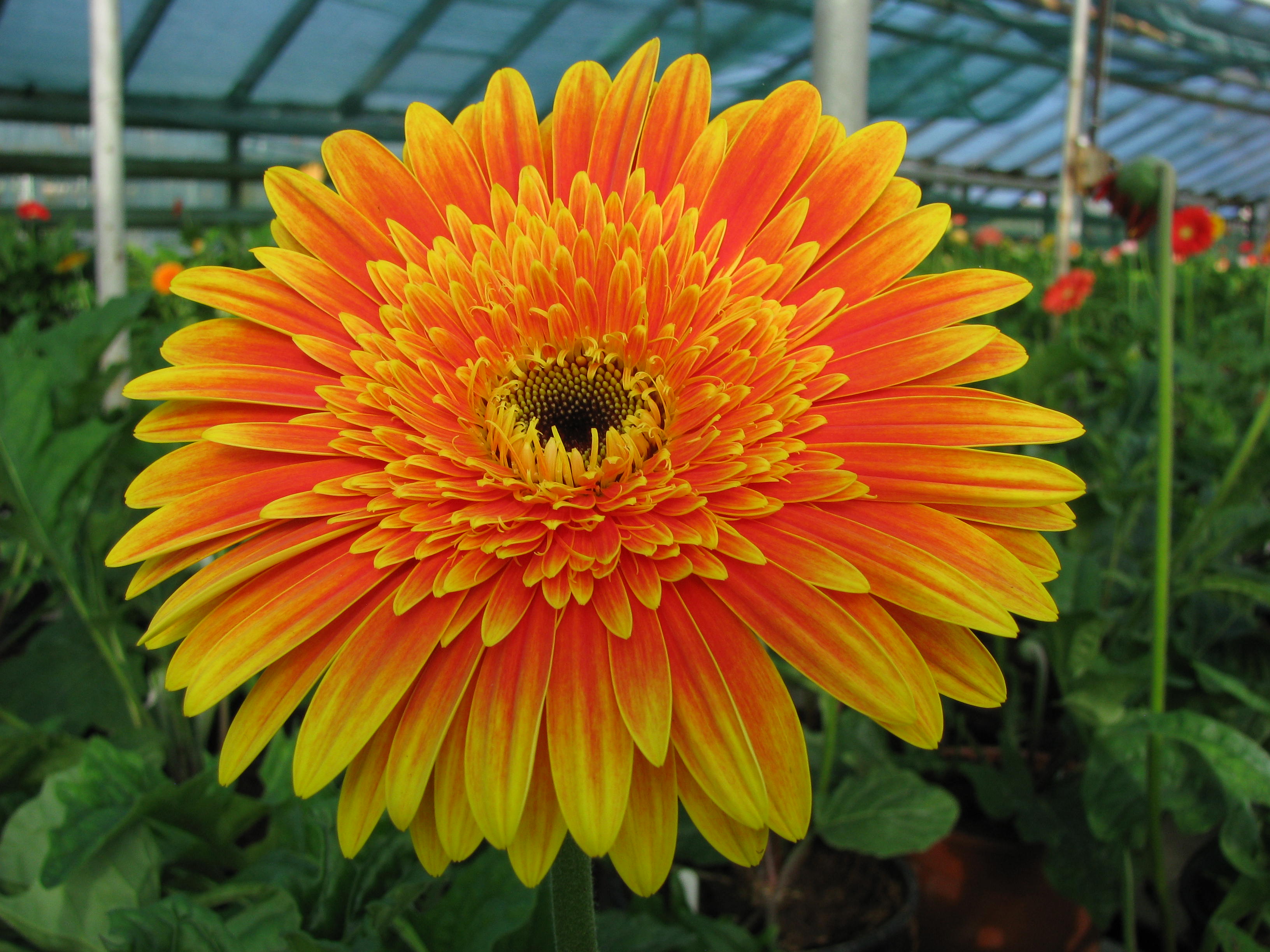 Morfoloģija. Ziedkopas oranžas, pildītas – diametrā 13,5 - 14,0 cm. Mēlziedi plati to gali noapaļoti, ar zobiņiem. Ziedkopas centrs – zaļš. Ziedkāti gari, 60 – 70 cm, noturīgi. Pirmajā audzēšanas gadā veido 1 – 2 dzinumus.
