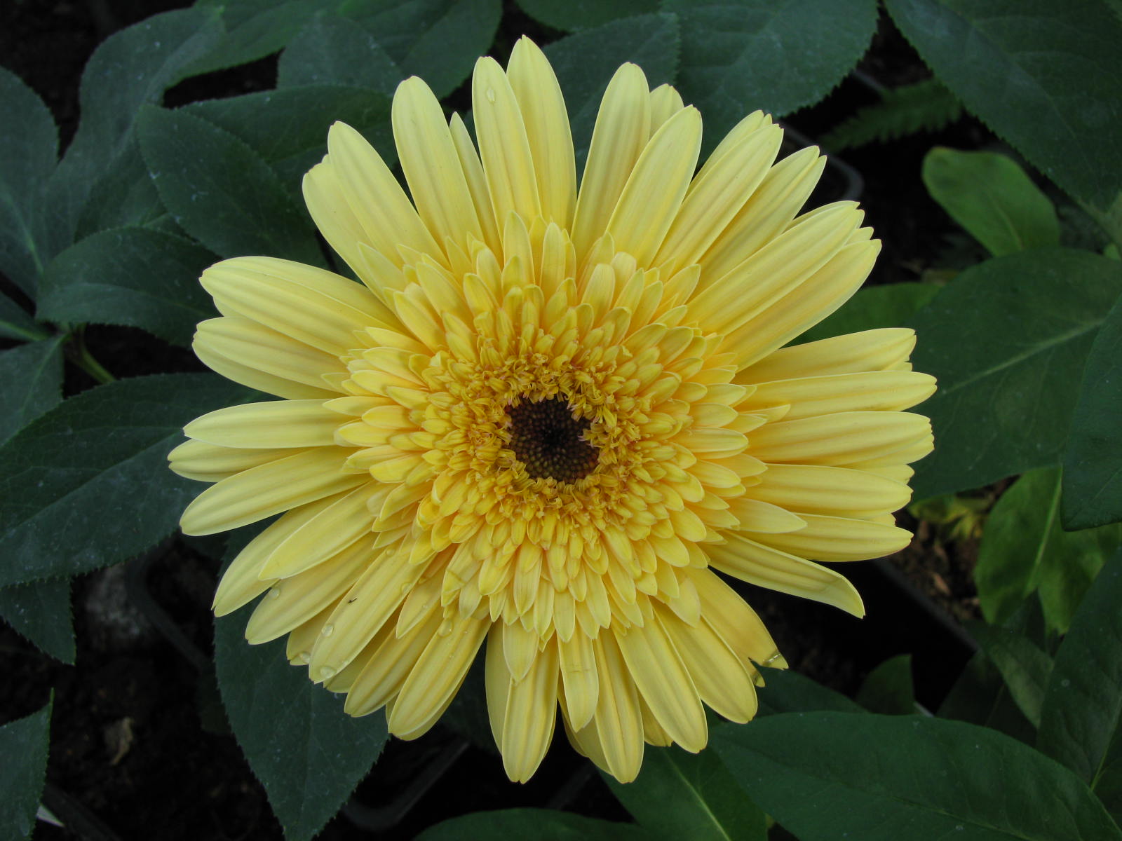 Morfoloģija. Ziedkopas sēra dzeltenas, pildītas – diametrā 11,0 -12,0 cm. Mēlziedi plati to gali noapaļoti, ar zobiņiem. Ziedkopas centrs – brūns. Ziedkāti, 50 – 60 cm gari, noturīgi. Pirmajā audzēšanas gadā veido 2 – 3 dzinumus.