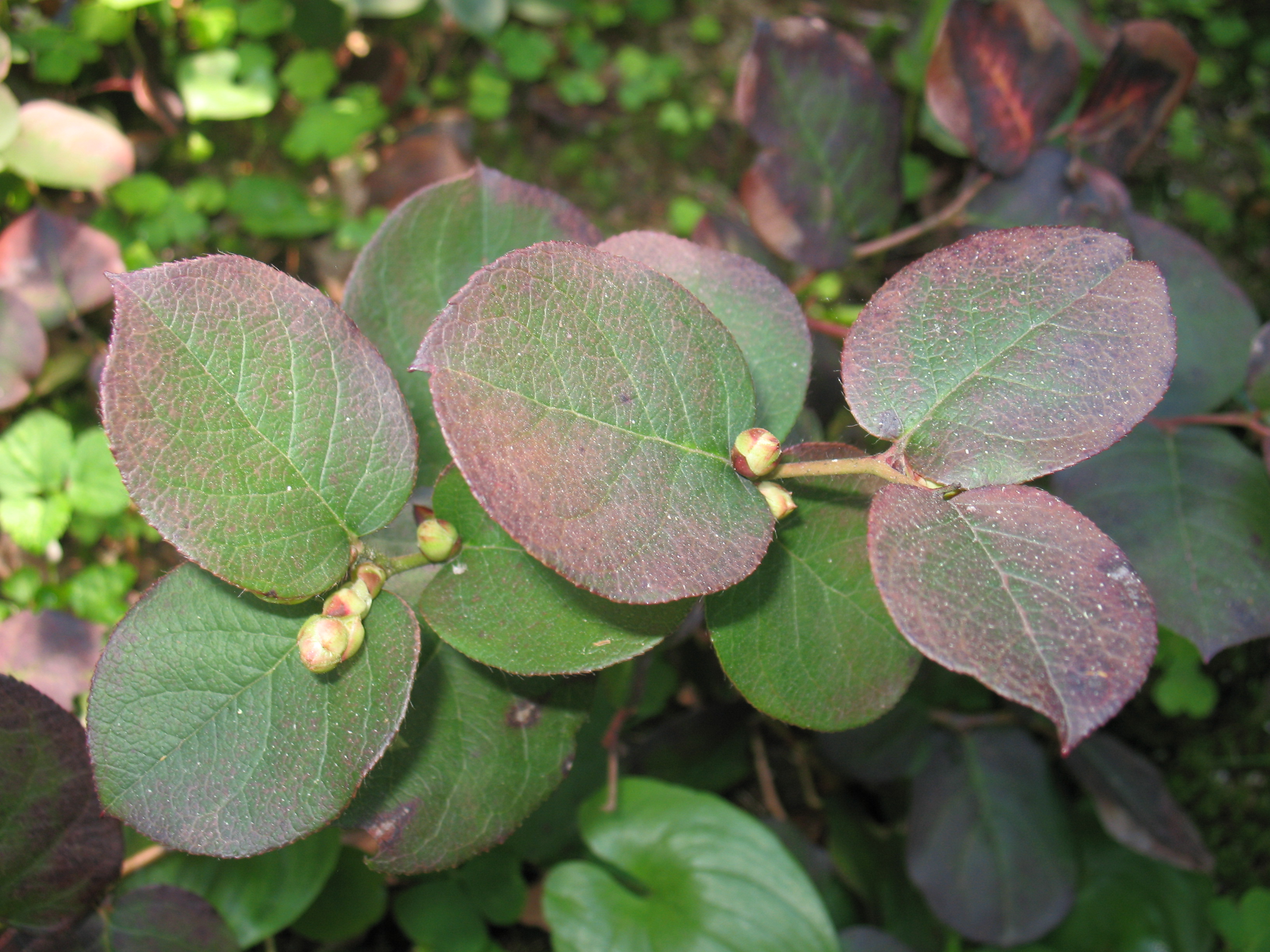 Morfoloģija. Mūžzaļš, ložņājošs pundurkrūms. Pārsvarā līdz 20 cm augsts, bet asis var izstiepties arī līdz 5 m garas. Zarojums blīvs. Lapas kailas, ādainas, ar robainu malu, olveida līdz ovālas, 5-10 cm garas un 3-5 cm platas, tumši zaļas. Ziedi sīki, ap 7-10 mm gari un plati, zvanveida, sakārtoti pa 5-15, nokarenos ķekaros, balti līdz sārti, smaržīgi. Zied jūnijā-jūlijā. Auglis apaļš, 6-10mm diametrā, tumši zils vai iesarkans, salds, aromātisks.