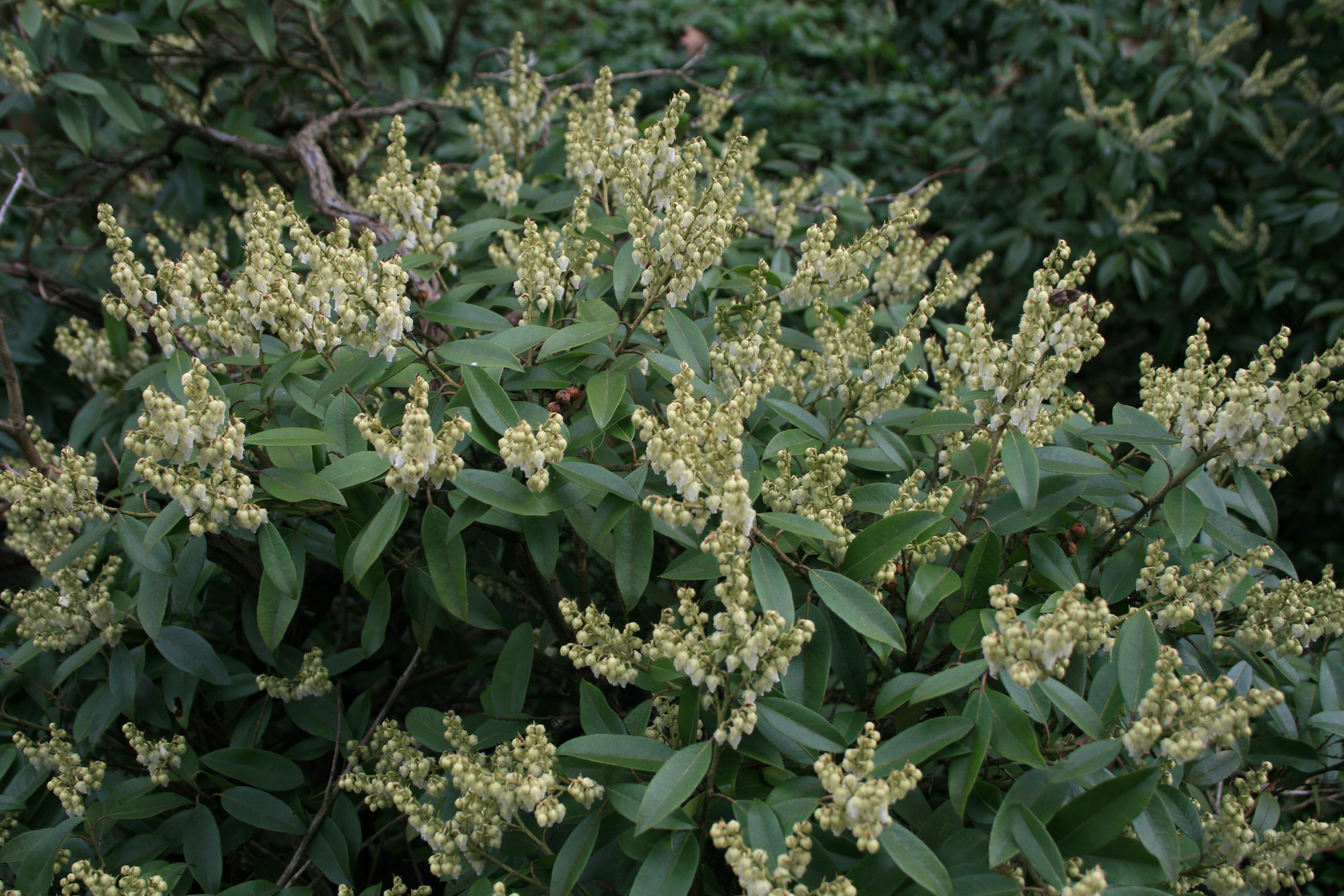 Morfoloģija. Mūžzaļš, stāvs krūms, reti kokveida liāna. Pārsvarā 1-2m augsts. Zarojums blīvs. Lapas kailas, ādainas, matētas, zaļas, eliptiskas līdz iegareni lancetiskas, 3-7cm garas un 1-3cm platas, mala sīkzobaina, skropstaina. Ziedi sīki, 4-7mm gari un 3-6mm plati, olveidīgi kausveida, sakārtoti 5-10cm garās, nokarenās galotnes skarās, balti, smaržīgi. Zied aprīlī-maijā.