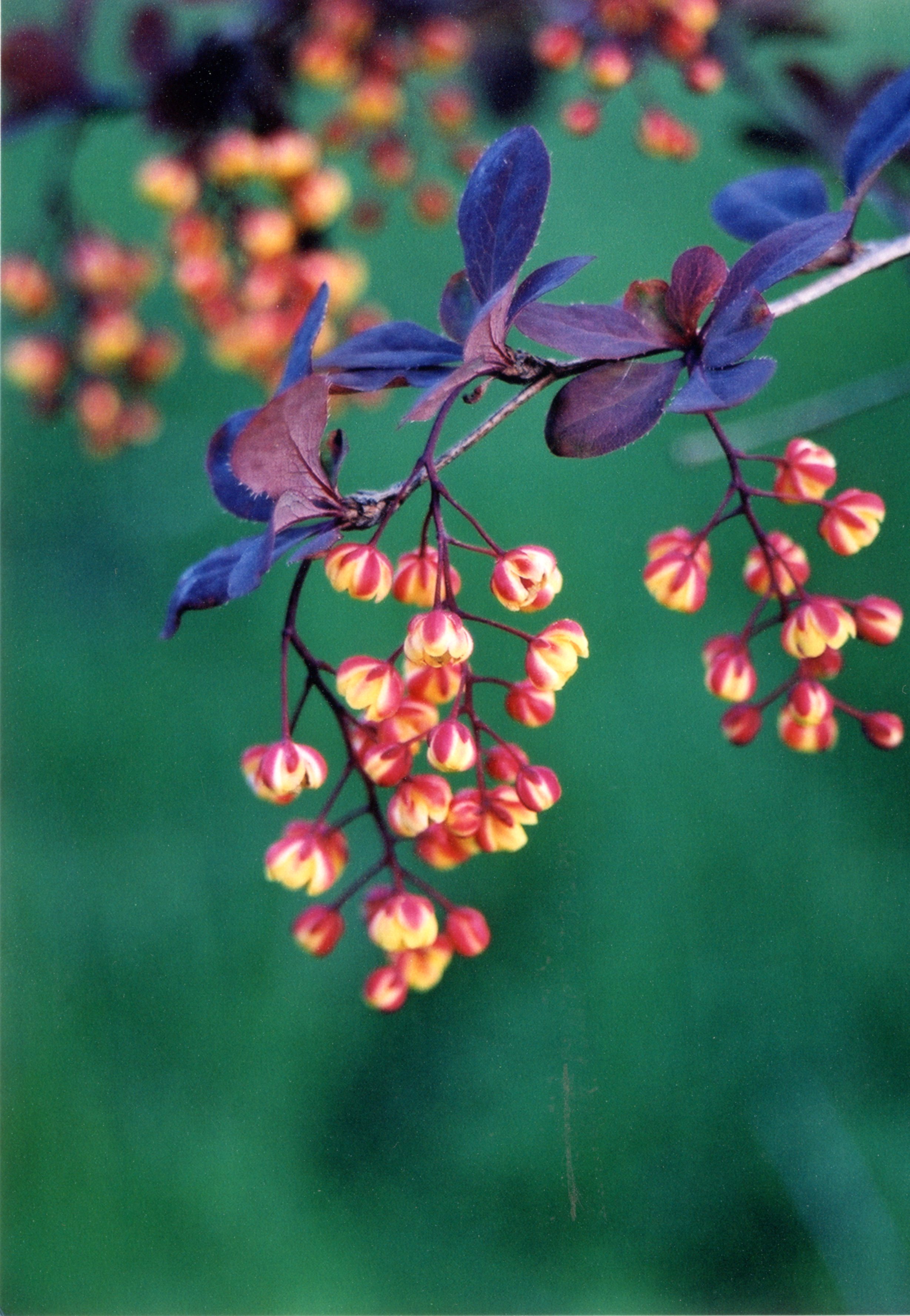Vasarzaļš, līdz 2,5 m augsts krūms ar izliektiem, pārkareniem zariem. Dzinumi gaiši brūni, šķautņaini vai rievaini, otrajā gadā kļūst pelēki. Pie lapu pamatnes 1-2 cm gari, viendaļīgi līdz trīsdaļīgi ērkšķi. Lapas 2,5-5 cm garas, otrādi olveida vai eliptiskas, skropstaini dzeloņaini zāģzobainas, virspuse tumši purpursarkana, apakšpuse gaišāka, ar apsarmi. Dzīslojums tīklveida. Zied maija vidū ar dzelteniem ziediem. Kauslapas tumši purpursarkanas. Ziedi divdzimumu, sakārtoti 4-6 cm garos ķekaros pa 15-25. Ogas 9-10 mm garas, tumši sarkanas, iegarenas, ar vieglu apsarmi.