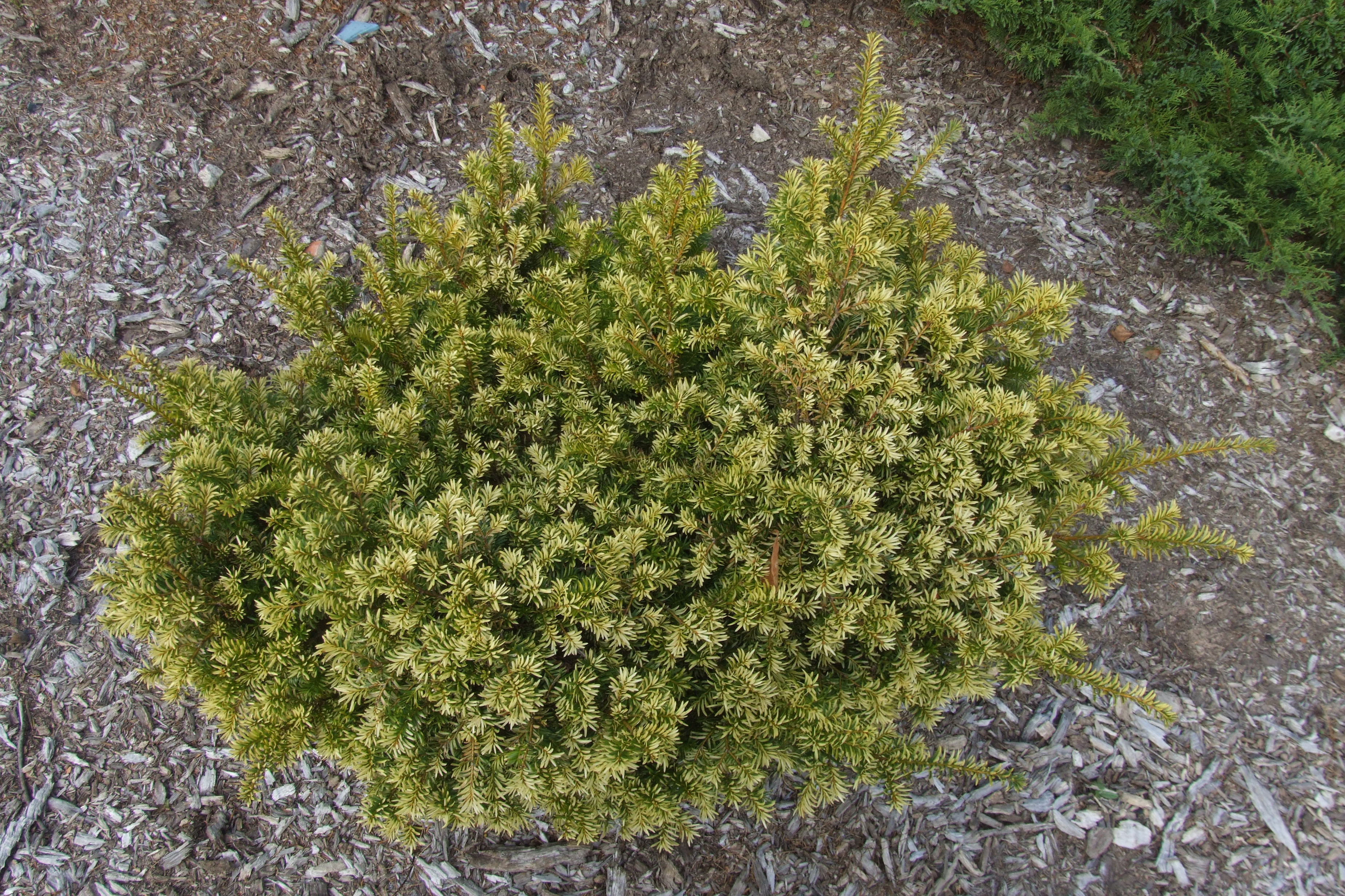 Morfoloģija. Mūžzaļš, stāvs blīvs krūms izplestiem zariem. 15 gados 1,7 m augsts un 1,2 m plats. Skujas izteikti 2 rindās. Pavasarī uz jaunajiem dzinumiem tās zelta dzeltenas, vēlāk krēmzaļas. Eksemplāriem augošiem noēnojumā skujas zaļas 1,5 cm garas un 0,2 cm platas. Sievišķais klons, bagātīgi ražo sēklas, arils (mīkstais sēklsedzis) sarkans.