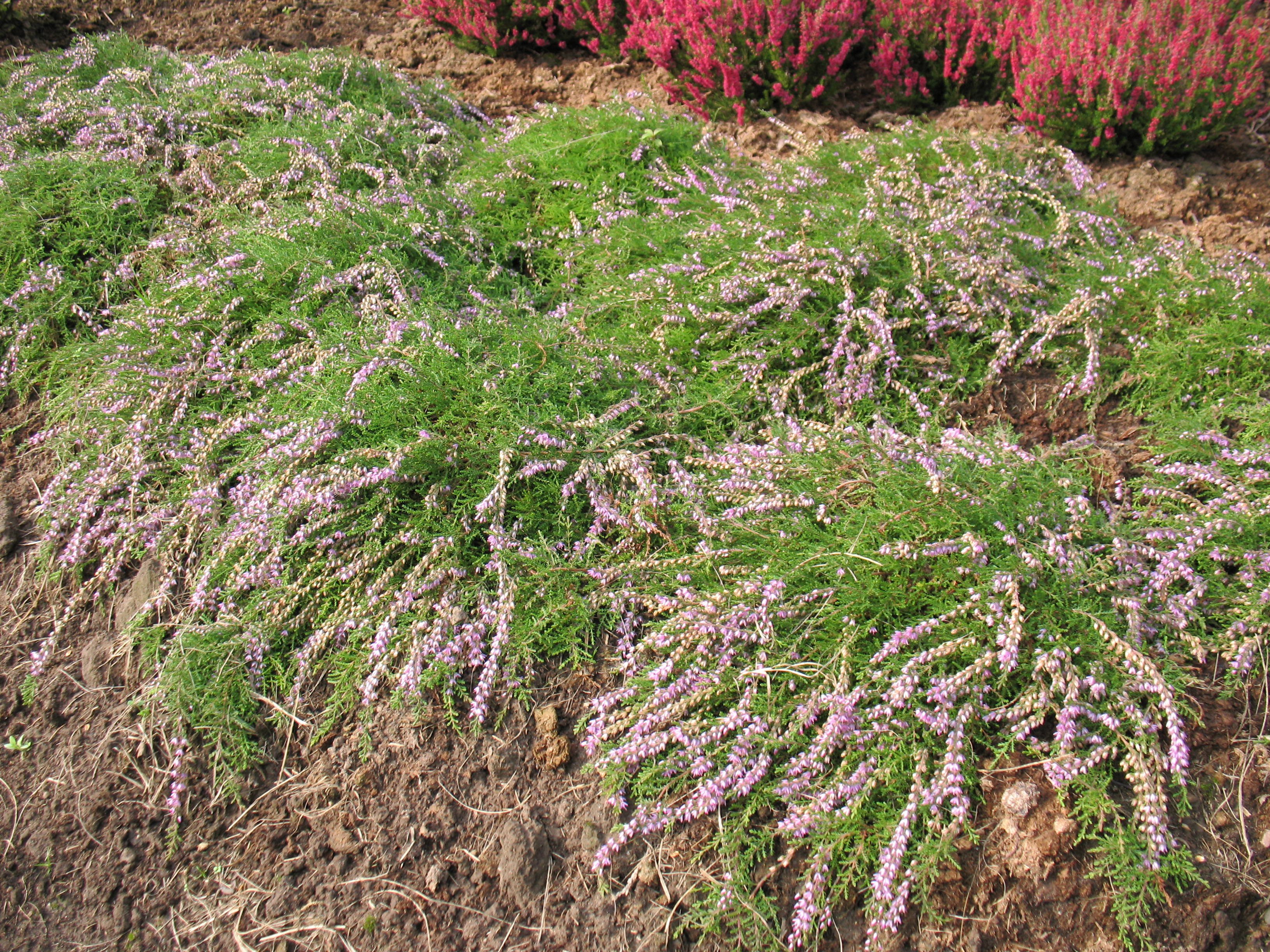 Morfoloģija. Mūžzaļš sīkkrūms ar smalku zarojumu. Vainags zems, lienošs, augstums līdz 10cm. Lapas sīkas, gaiši zaļas ar purpurbrūnu nokrāsu. Ziedi violeti sarkani, vienkārši, sakārtoti īsos, skrajos galotnes ķekaros. Zied no augusta vidus līdz septembra vidum.