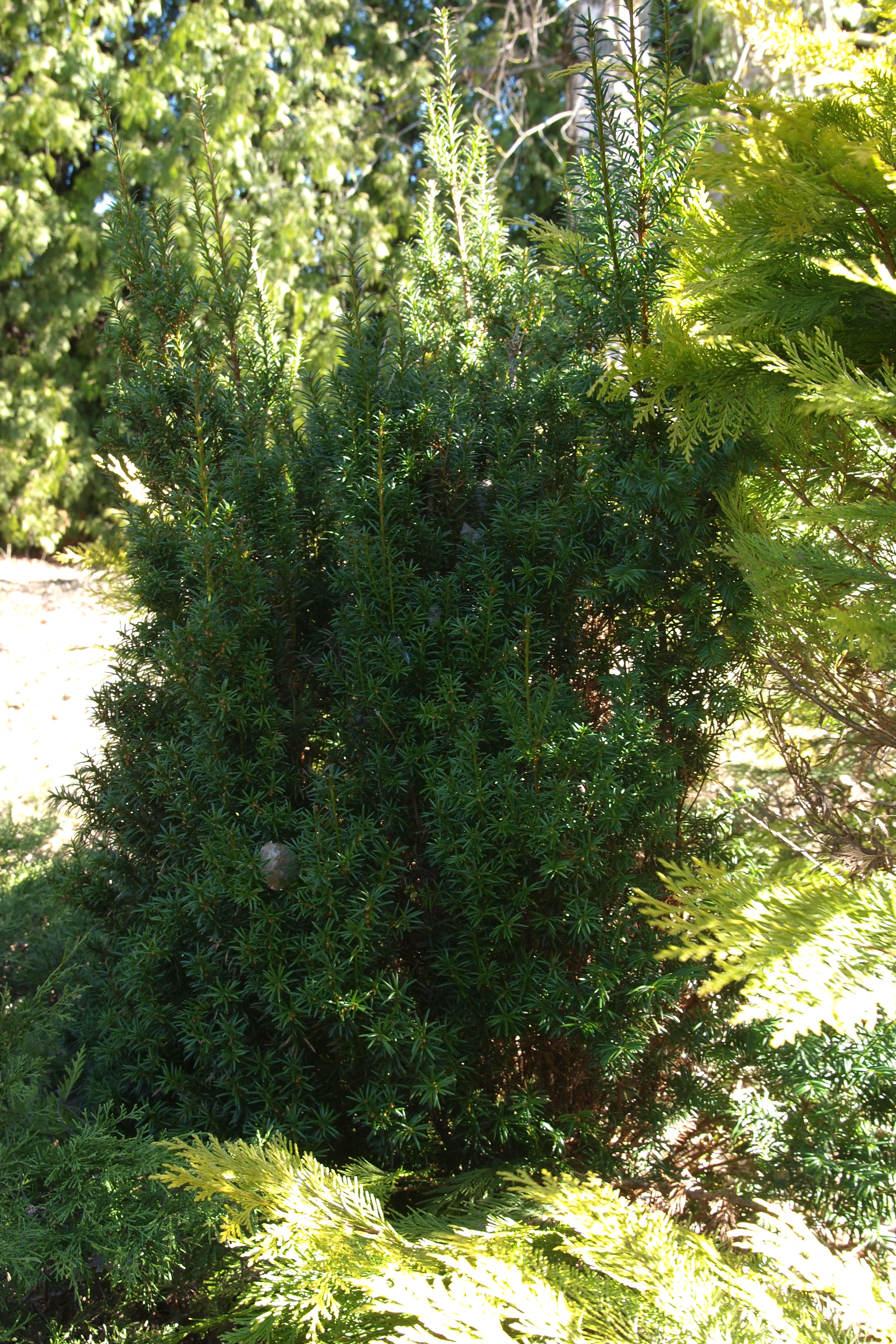 Morfoloģija. Mūžzaļš, spēcīgs, stāvs krūms ar augšupvērstiem, izplestiem zariem, vīrišķais klons. Krūma platums pārsniedz augstumu un tas var sasniegt 8m. Skujas šauras, pelēki zaļas. Ļoti ziemcietīga šķirne.