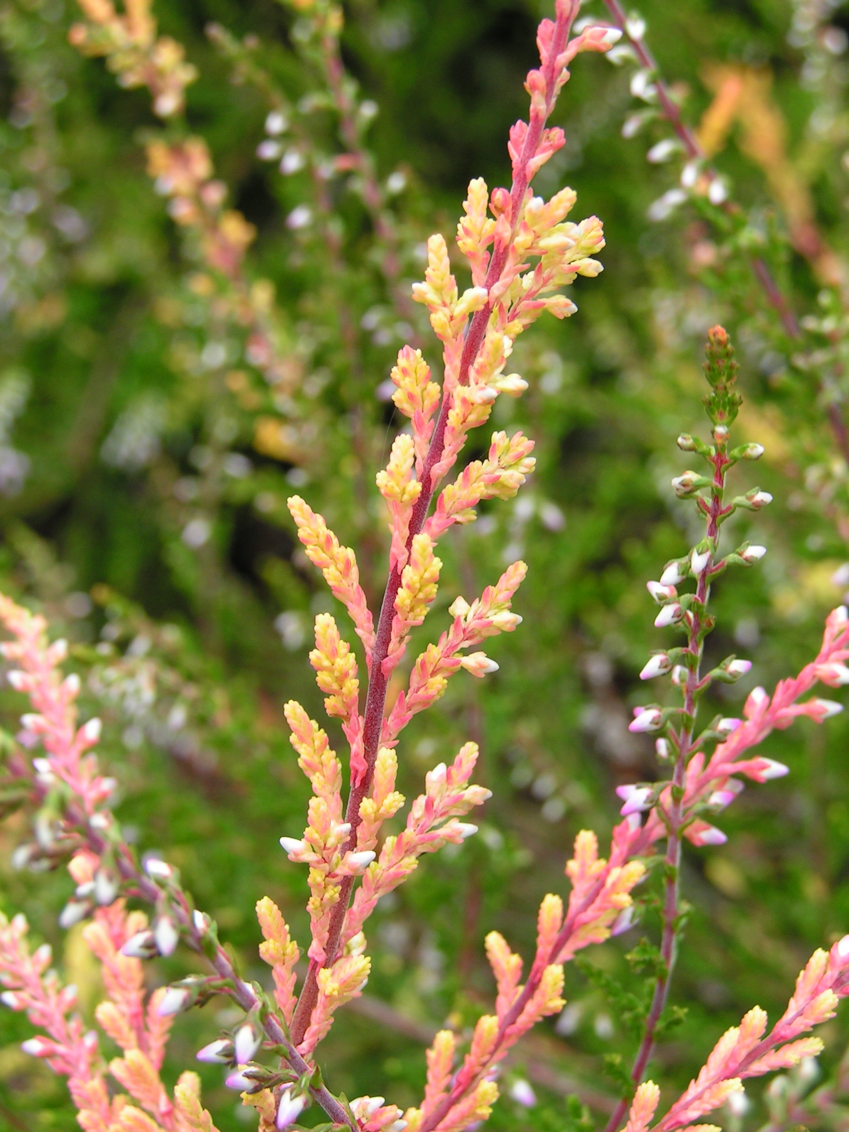 Morfoloģija. Mūžzaļš sīkkrūms ar stāvu, smalku, paskraju zarojumu. Vainaga augstums 25-30cm. Lapas sīkas, tumši zaļas. Atsevišķu dzinumu gali gaiši dzelteni, kas ziemā krāsojas oranžsarkani. Ziedi violeti rozā, vienkārši, sakārtoti īsos galotnes ķekaros. Zied no augusta beigām līdz septembra beigām.