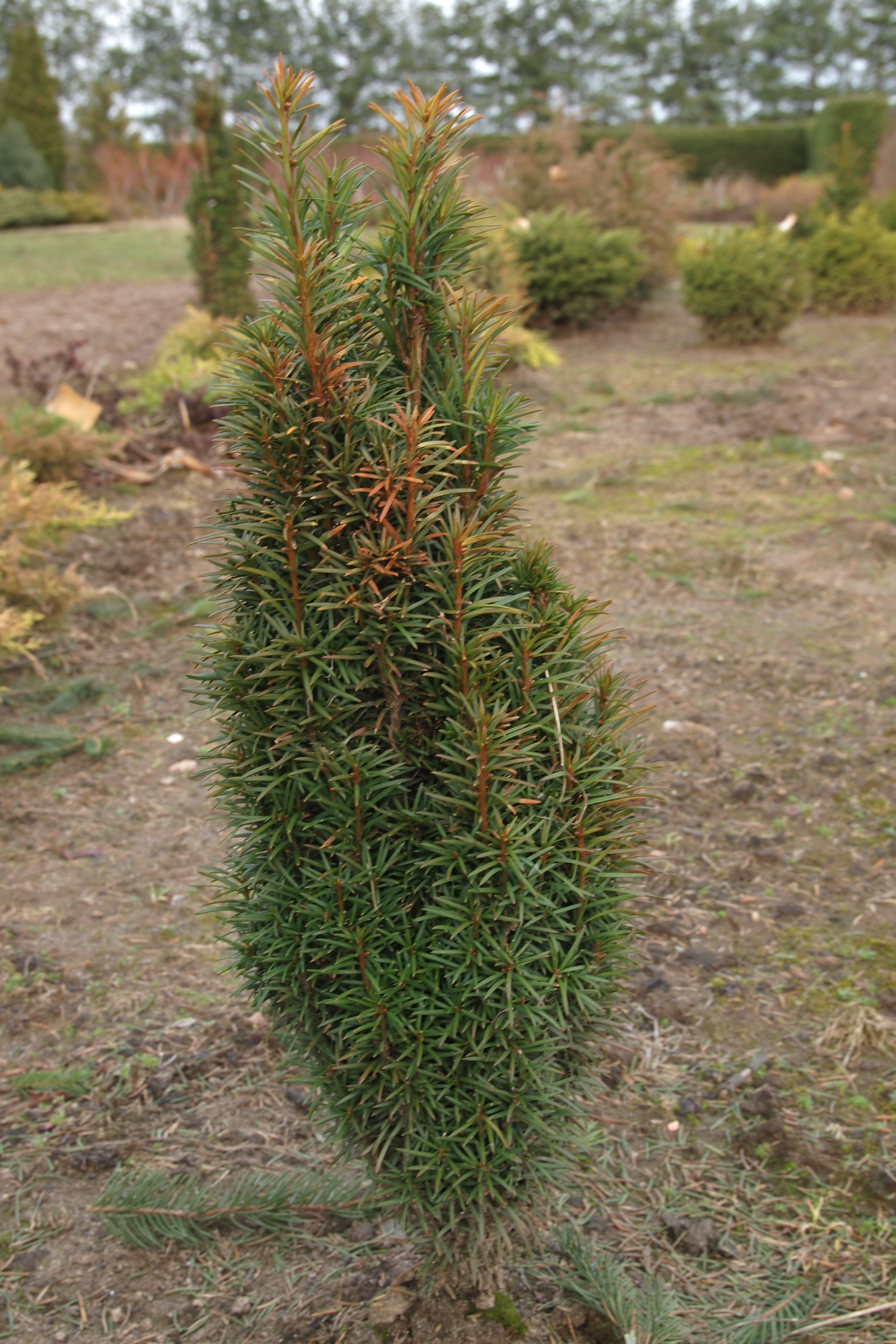 Morfoloģija. Mūžzaļš krūms, gandrīz konisks. Tas veidots no taisniem uz augšu vērstiem zariem. 15 gados sasniedz 1,5 – 3 m augstumu un 0,6 – 0,9 m platumu. Skujas izvietotas uz visām pusēm 2,0 – 3,0 cm garas, sagrieztas uz leju, tumši zaļas. Sievišķais klons Arils (mīkstais sēklsedzis) izstieptas formas, spilgti sarkans.