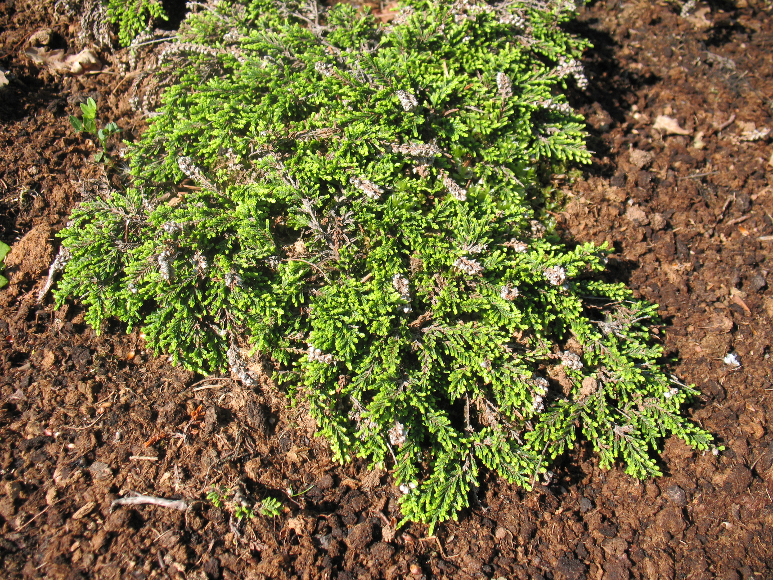 Morfoloģija. Mūžzaļš sīkkrūms ar lienošu, blīvu zarojumu. Vainaga augstums 5cm, platums15-20cm. Lapas sīkas, koši zaļas. Ziedi balti, vienkārši, sakārtoti garos, vienpusējos galotnes ķekaros. Zied no augusta līdz septembrim.