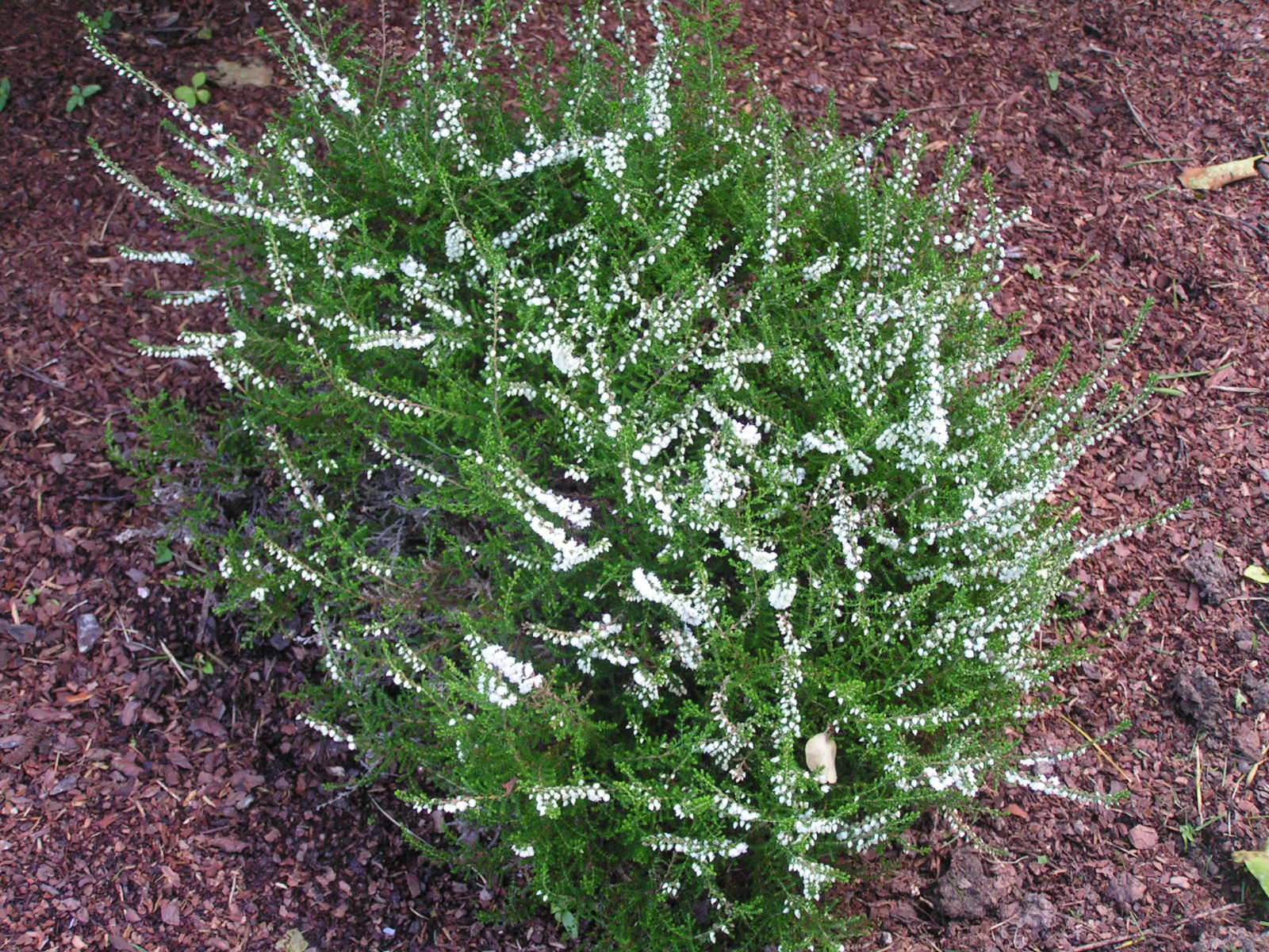 Morfoloģija. Mūžzaļš sīkkrūms ar stāvu, plašu zarojumu. Vainaga augstums 20-25cm. Lapas sīkas, tumši zaļas. Ziedi balti, pildīti, sakārtoti garos, blīvos galotnes ķekaros. Zied tik bagātīgi, ka pilnziedā gandrīz nosedz lapas. Zied no augusta līdz septembrim.