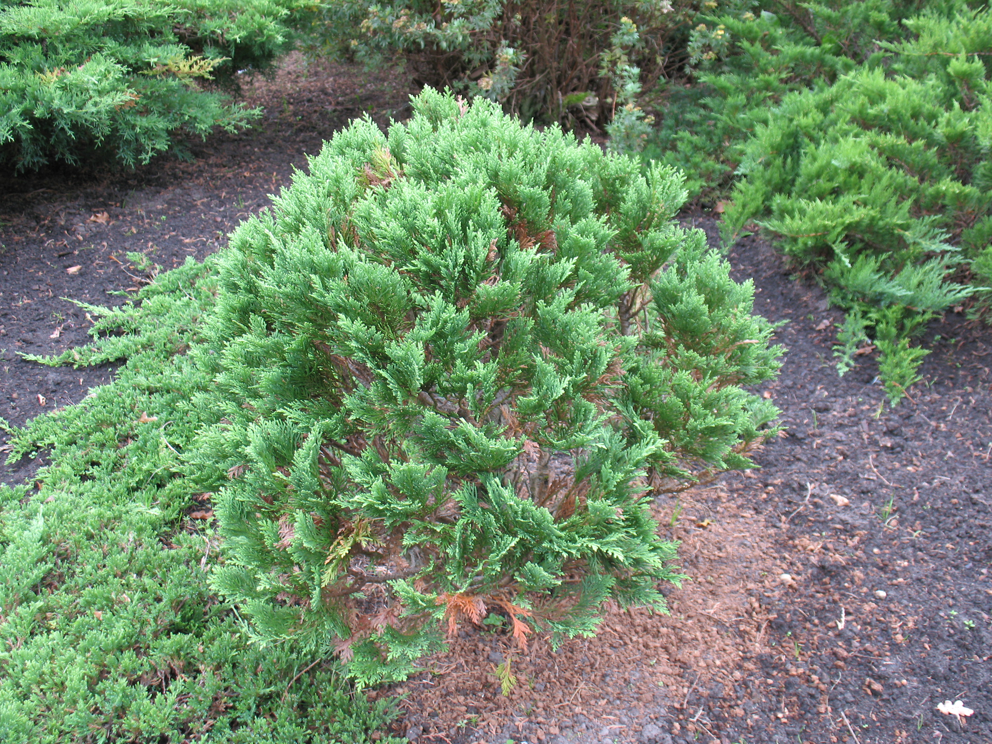 Morfoloģija. Mūžzaļš, lēnaudzīgs krūms ar zemu, blīvu olveida līdz plati konisku vainagu. 20 gadu vecumā sasniedz 0,8m augstumu un 0,7m platumu. Miza gluda, spīdīga, pelēkbrūna. Dzinumi plakani, skujas zvīņveida, virspusē zilganpelēkzaļas, apakšpusē blāvākas ar gaišākām, skaidri redzamām atvārsnīšu līnijām. Augam ļoti patīkama, spēcīga sveķu smarža.
