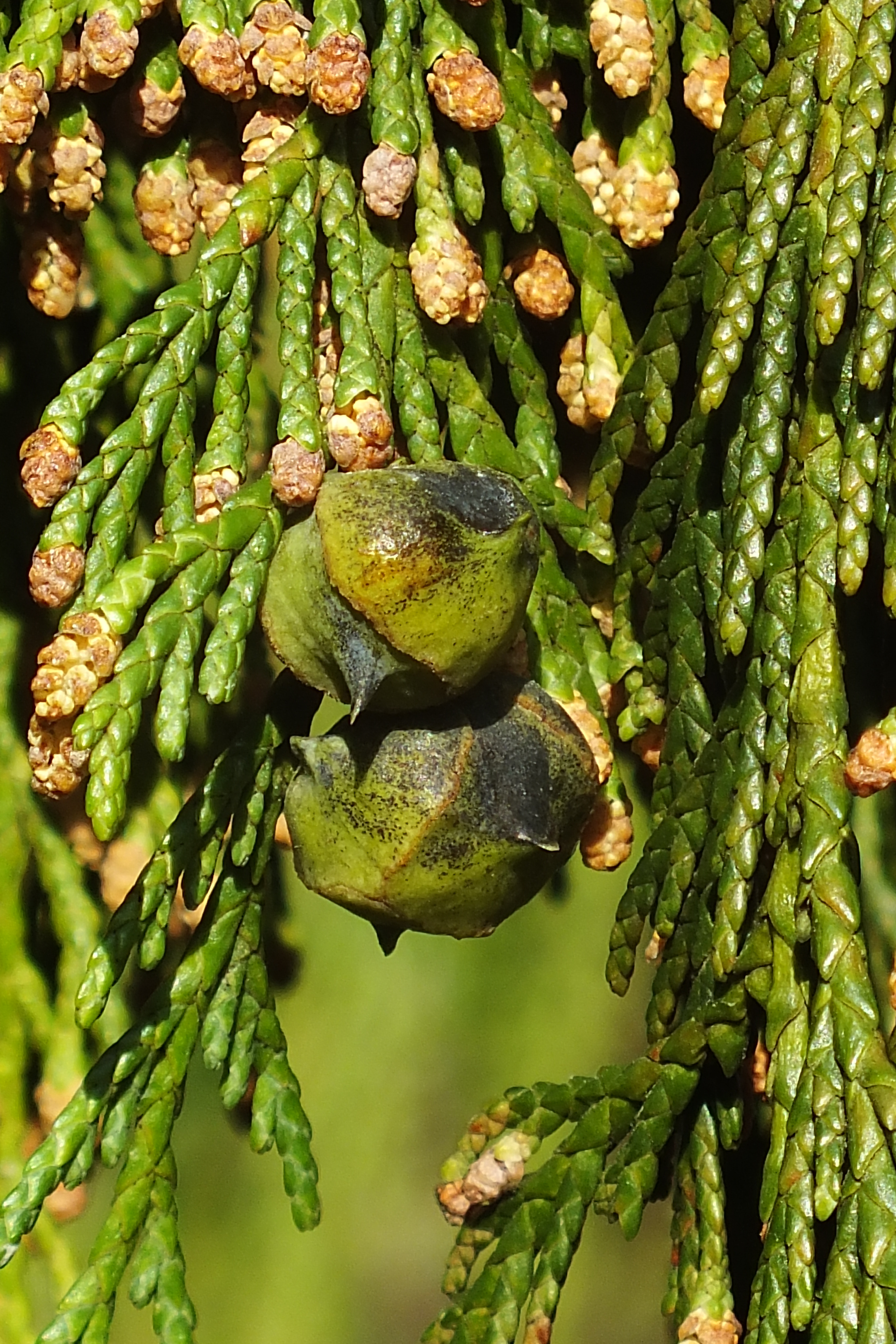 Morfoloģija. Mūžzaļš koks ar šauri konisku vainagu, izteikti nokareniem zariem un galotni. Dzimtenē sasniedz 40m augstumu. Latvijā 35 gadu vecumā sasniedz 4m augstumu un 1m platumu. Miza gluda, spīdīga, pelēcīgi sarkanbrūna. Dzinumi plakani, skujas zvīņveida, 3-5mm garas, virspusē tumši zaļas, apakšpusē gaišākas. Augam ļoti patīkama, spēcīga sveķu smarža. Čiekuri nelieli, lodveida, sastāv no 4 čiekurzvīņām.