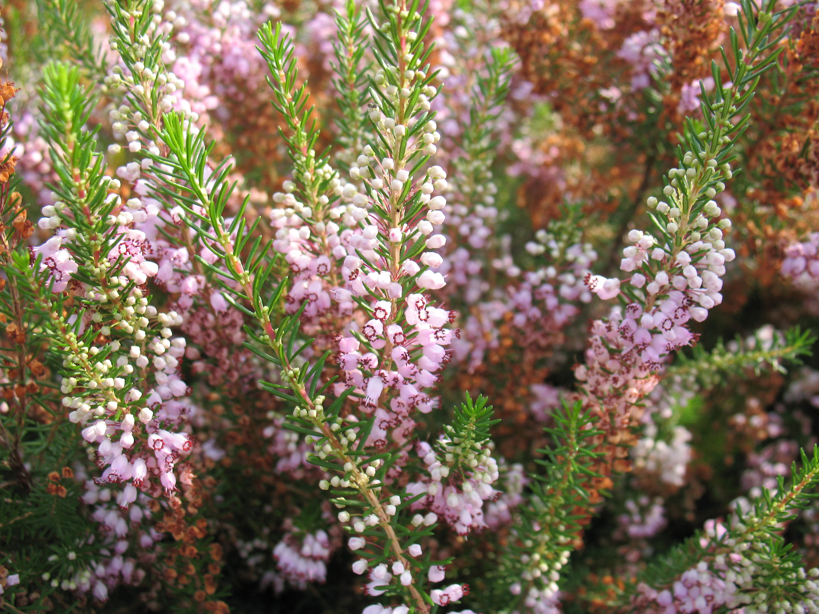 Morfoloģija. Mūžzaļš sīkkrūms ar klājenisku, plašu vainagu un smalku, blīvu zarojumu. Vainaga augstums 35-40cm, platums 40-50cm. Lapas sīkas, smailas, atstāvošas, zaļas. Ziedi ļoti gaiši sārti, gandrīz balti, sakārtoti garos, cilindriskos galotnes ķekaros. Zied no jūlija līdz septembrim.