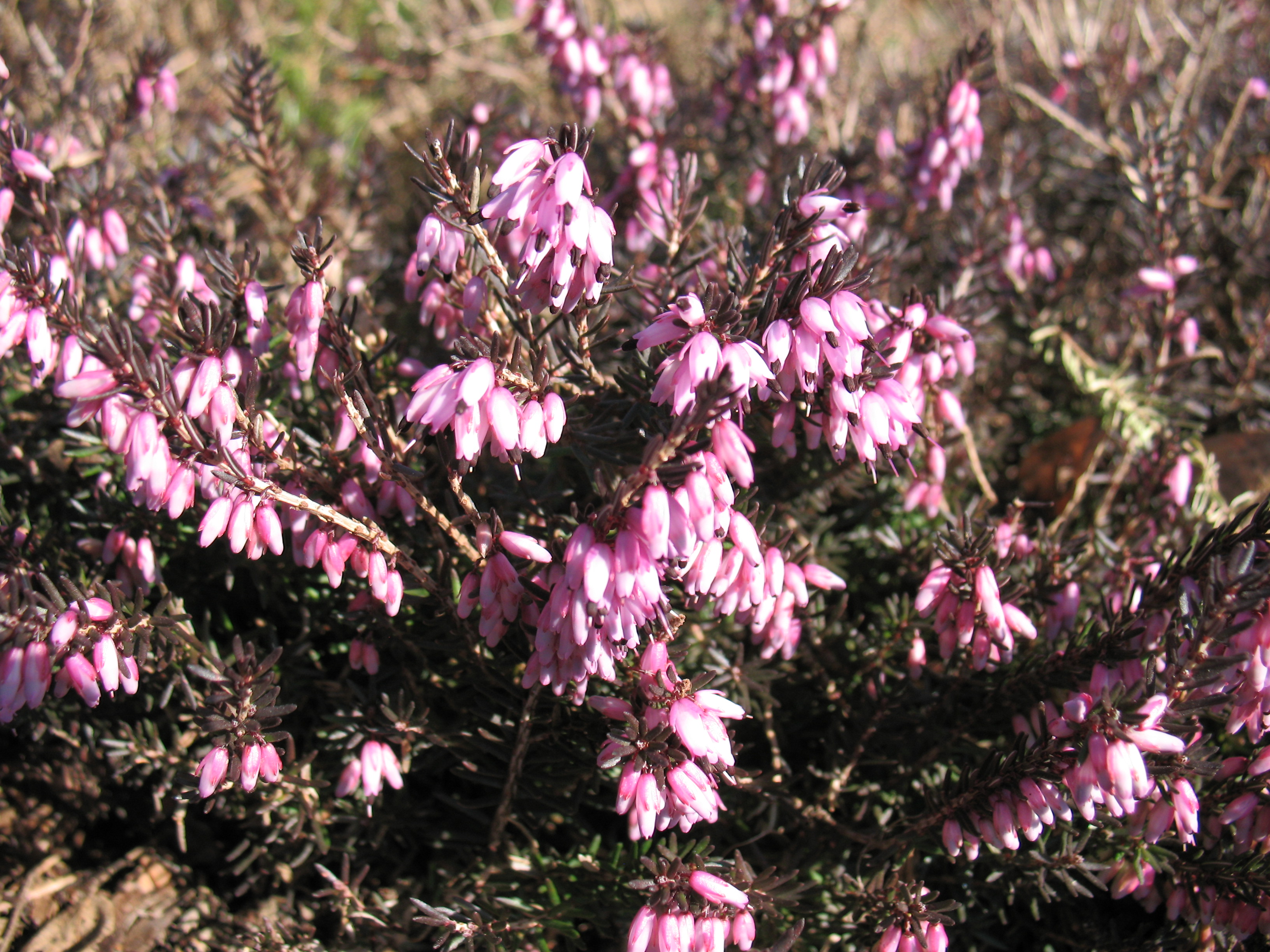 Morfoloģija. Mūžzaļš sīkkrūms ar klājenisku, plašu vainagu un smalku, blīvu zarojumu. Vainaga augstums 15cm, platums 25-30cm. Lapas sīkas, smailas, atstāvošas, tumši zaļas. Ziedi rozā, sakārtoti vienpusējos galotnes ķekaros. Zied no marta beigām līdz aprīļa beigām.
