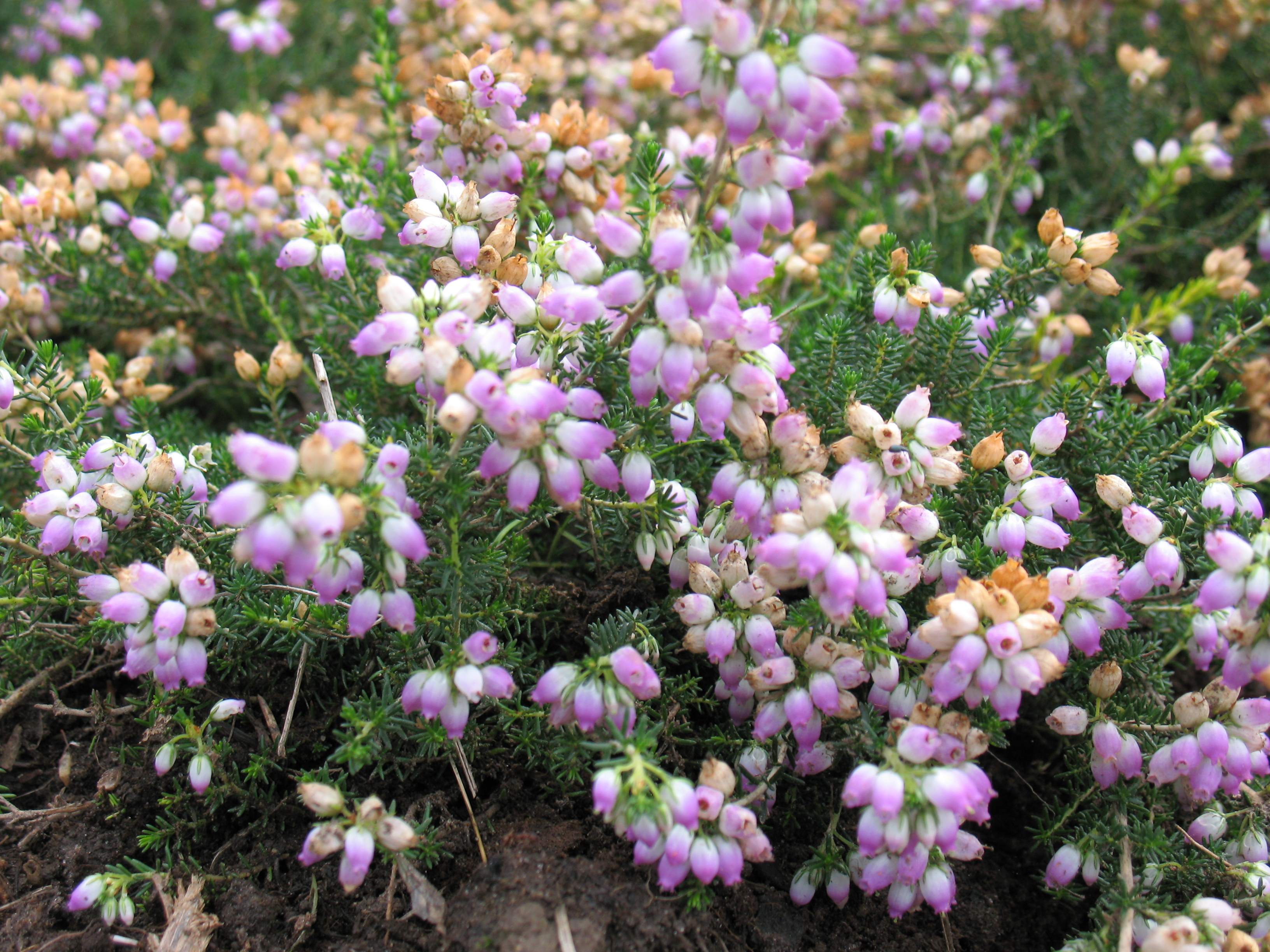 Morfoloģija. Mūžzaļš sīkkrūms ar klājenisku, izplestu vainagu un smalku zarojumu. Vainaga augstums 15cm, platums 15-20cm. Lapas sīkas, tumši zaļas. Ziedi krūzveida, galos purpurrozā, pie pamata balti. Zied no jūnija vidus līdz septembra vidum.