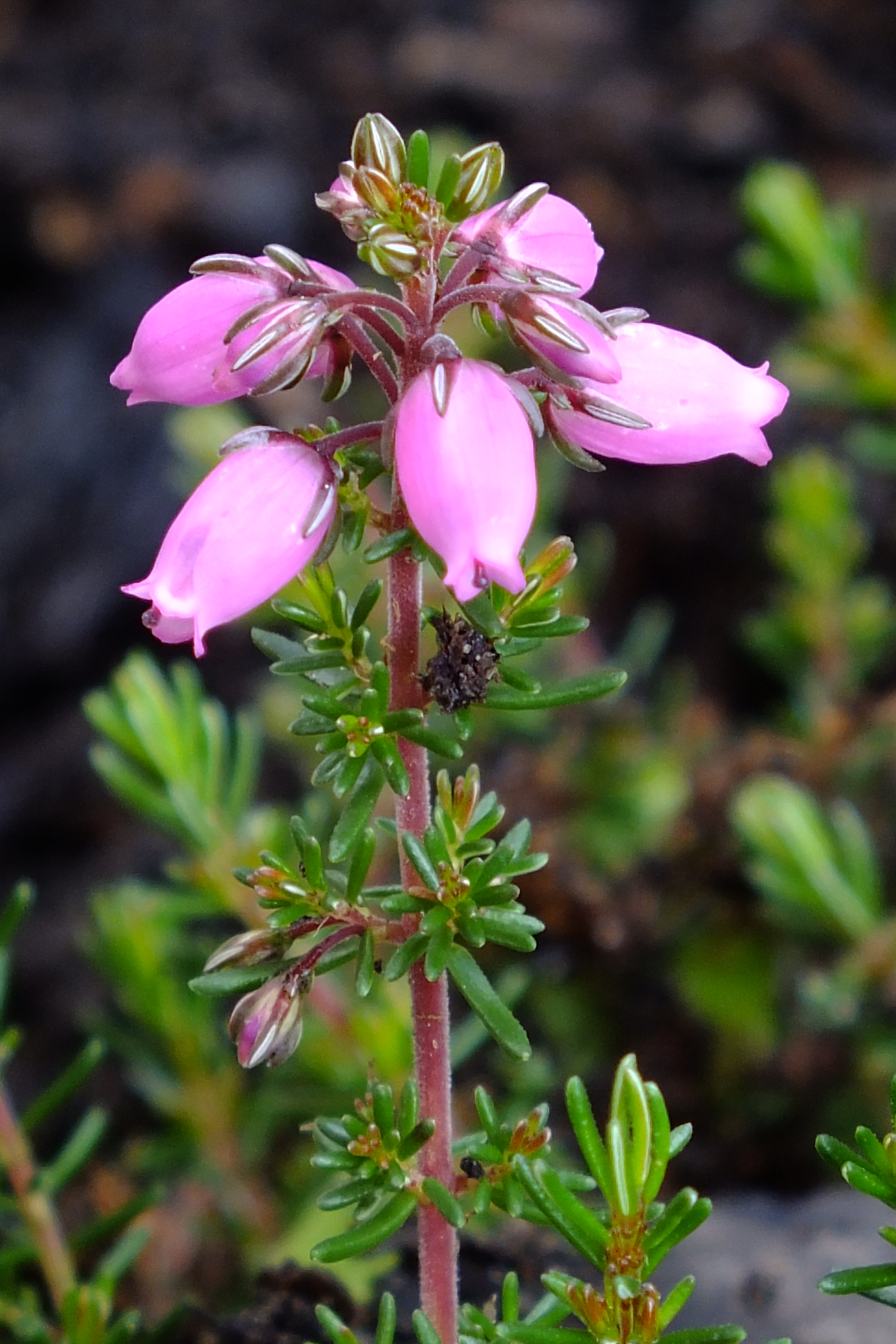 Morfoloģija. Mūžzaļš sīkkrūms ar klājenisku, izplestu vainagu un smalku, blīvu zarojumu. Vainaga augstums 10-15cm, platums 15-20cm. Lapas sīkas, tumši zaļas. Ziedi krūzveida, sārti. Zied no jūnija vidus līdz septembra vidum.