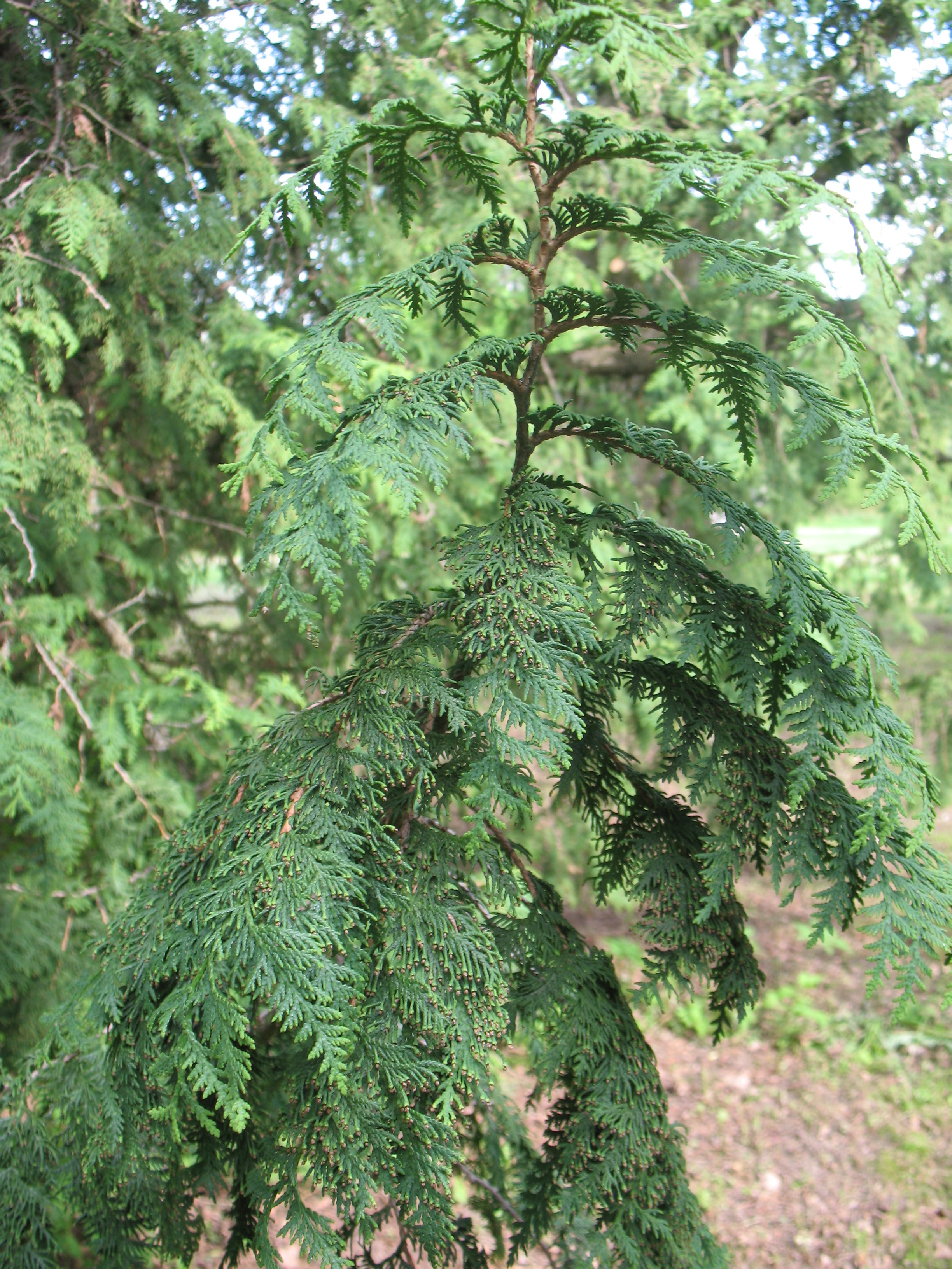 Morfoloģija. Mūžzaļš koks ar slaidu, uz augšu vērstu, irdenu vainaga formu. Koka augstums 2-3m, platums 0,7-1,2m. Gada pieaugums garumā līdz 0,2m. Desmit gados var izaugt 2m garumā un 0,8m platumā. Skeleta zari ieliekti. Skuju plātnes sekstveida, divrindu, iegrieztas. Skujas pelēkzaļas.