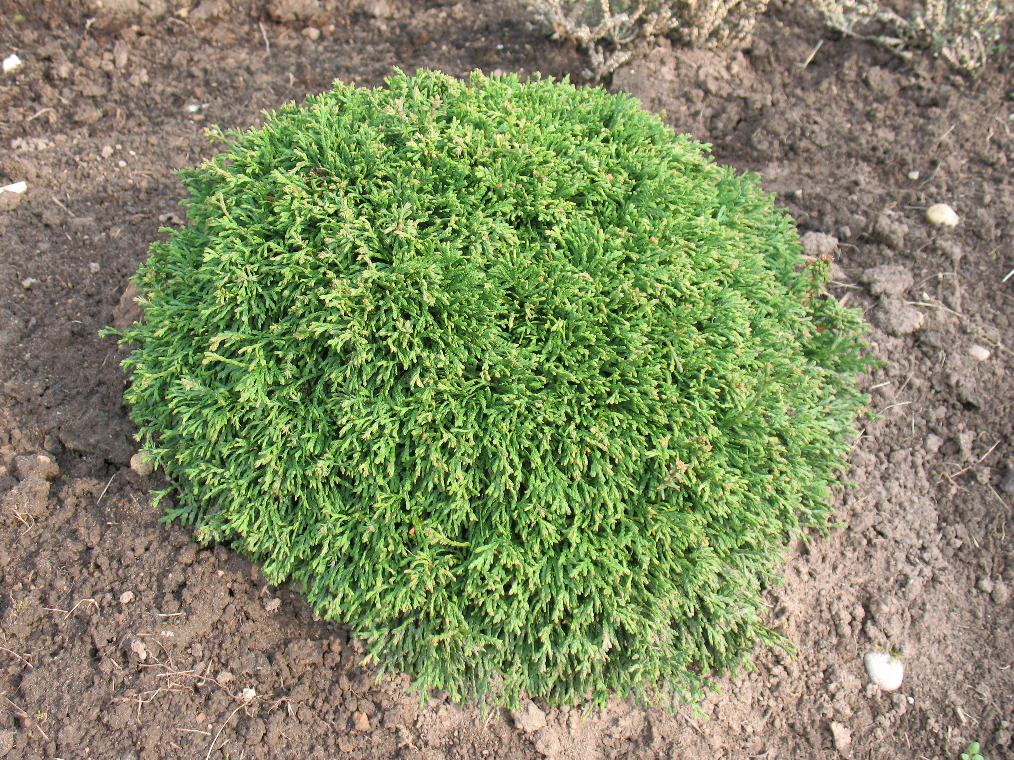 Morfoloģija. Mūžzaļš, lēnaudzīgs pundurkoks ar neregulāru plakani ovālu vainaga formu. Koka augstums 0,5-0,8m un platums 0,8-1,2m. Zarojums blīvs. Zari stingri, nedaudz pacilus. Veido vairākas galotnes. Skujas smalkas zvīņveida, pelēcīgi zaļā krāsā, ziemā krāsojas izteiksmīgā rūsganā bronzas krāsā.