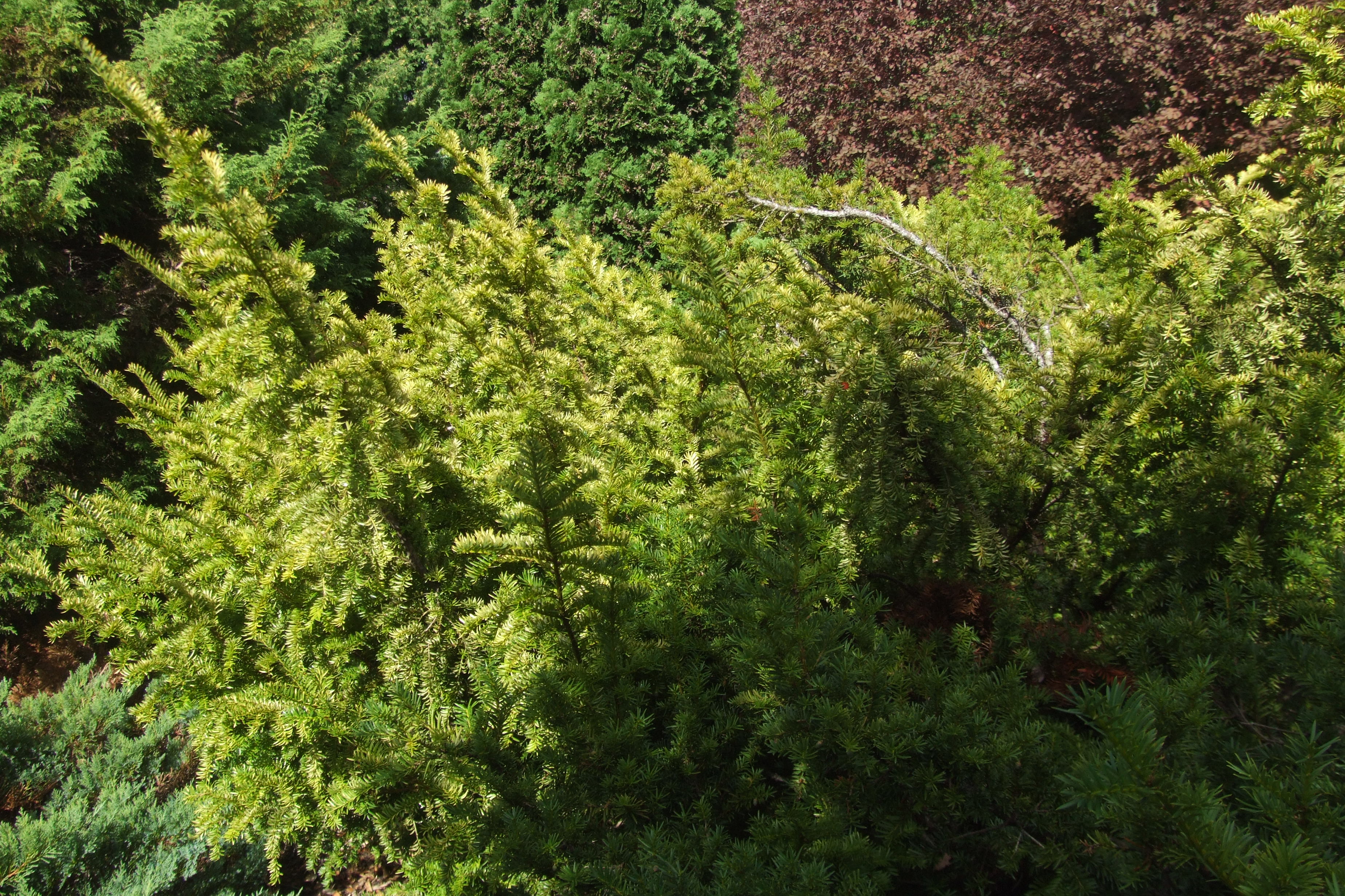 Morfoloģija. Mūžzaļš, irregulārs ar stāvu zarojumu krūms. Skujas 2 rindās, nedaudz deformētas, zaļas ar sudrabaini – baltu maliņu, 20 cm garos un 0,2 cm platas. Sievišķais klons.