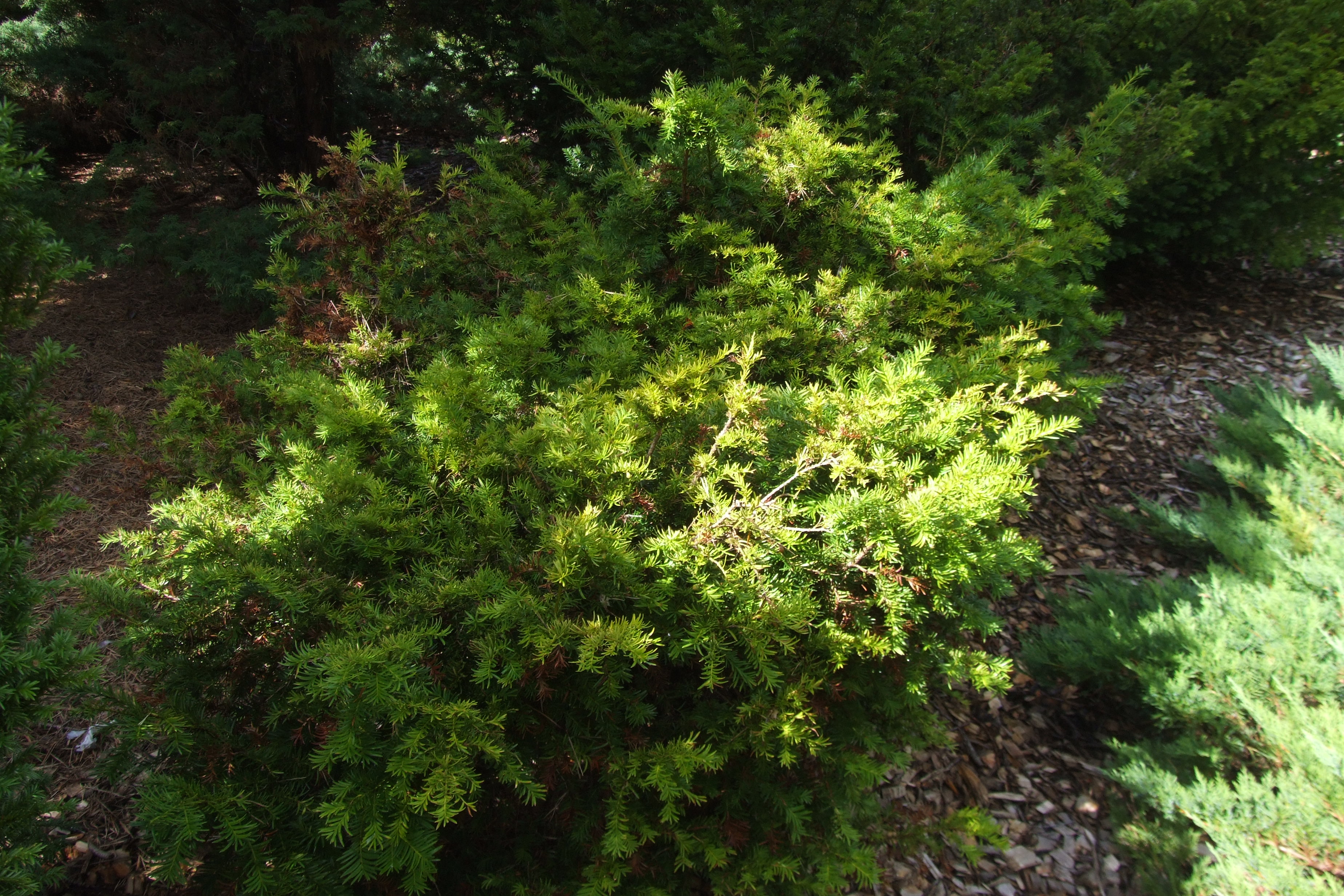 Morfoloģija. Mūžzaļš, kompakts krūms ar izplestiem zariem un īsiem brīvi krītošiem viļņoti – sagrieztiem jauniem dzinumiem. 15 gados sasniedz 2 m augstumu un 2,5 m platumu. Skujas parasti 2 rindās, sirpjveidīgas ar smailu galu, 2,5 cm garas un 0,3 cm platas, dzelteni zaļas, ar izteikti dzeltenu maliņu, kas ziemā ir bronzas krāsā. Ļoti bagātīgi ražojošs sievišķais klons, arils (mīkstais sēklsedzis) – sarkans.