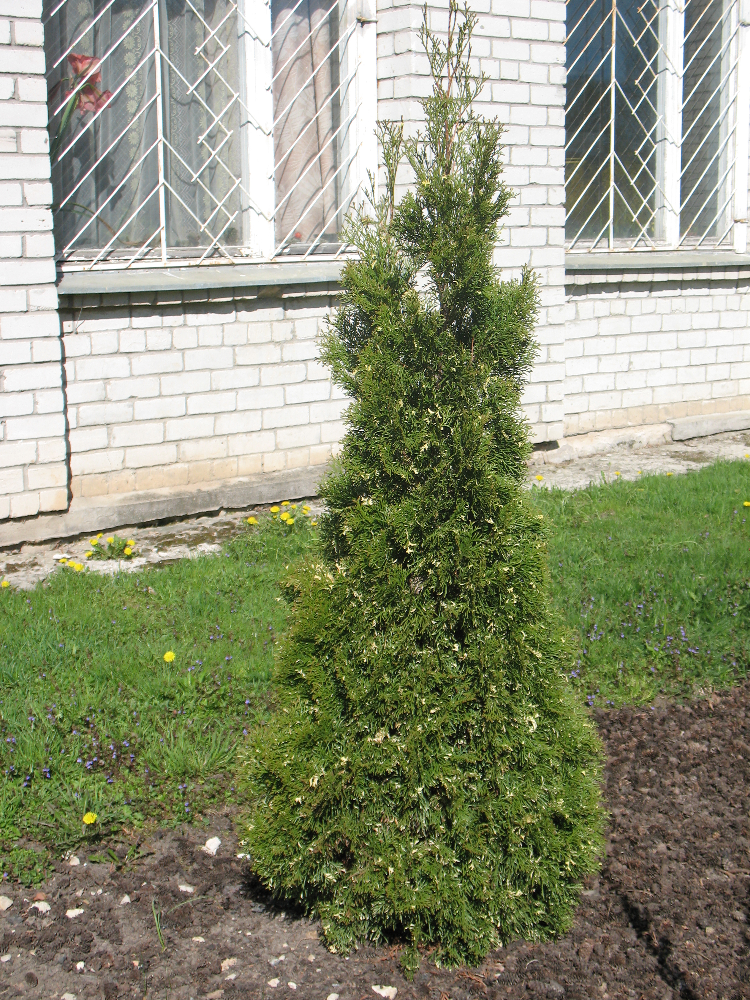 Morfoloģija. Mūžzaļš, dzeltenraibs koks ar kompaktu, piramidālu, galotnē nedaudz noapaļotu vainaga formu. Koka augstums 2-3m un platums 0,8-1,2m. Salīdzinoši neliels skeleta zaru skaits. Sānu zari reti izvietoti. Dzinumi vērsti uz augšu. Skujas sulīgā zaļā krāsā, spīdīgas un atšķirībā no ‘Smaragd’ viscaur uz skujām ir krēmdzelteni plankumi.
