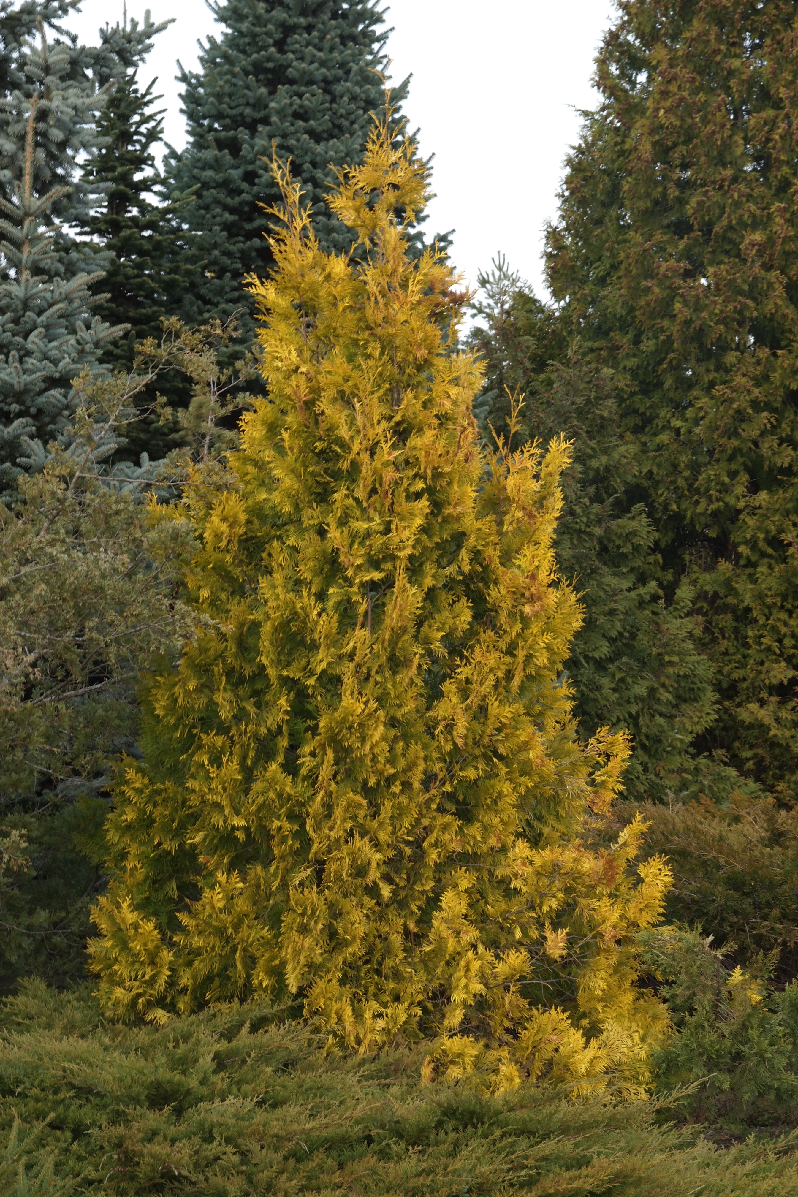 Morfoloģija. Mūžzaļš, diezgan ātri augošs koks ar kompaktu, konisku vainaga formu. Koka augstums 3-5m un platums 1-2m. Desmit gados izaug 2-3m augstumā un līdz 1m platumā. Zarojums blīvs, ar platām skuju plātnēm. Skujas zeltaini dzeltenas vasarā, ziemā ar purpursārtiem lāsumiem. Jaunie dzinumi pavasarī citrondzelteni.