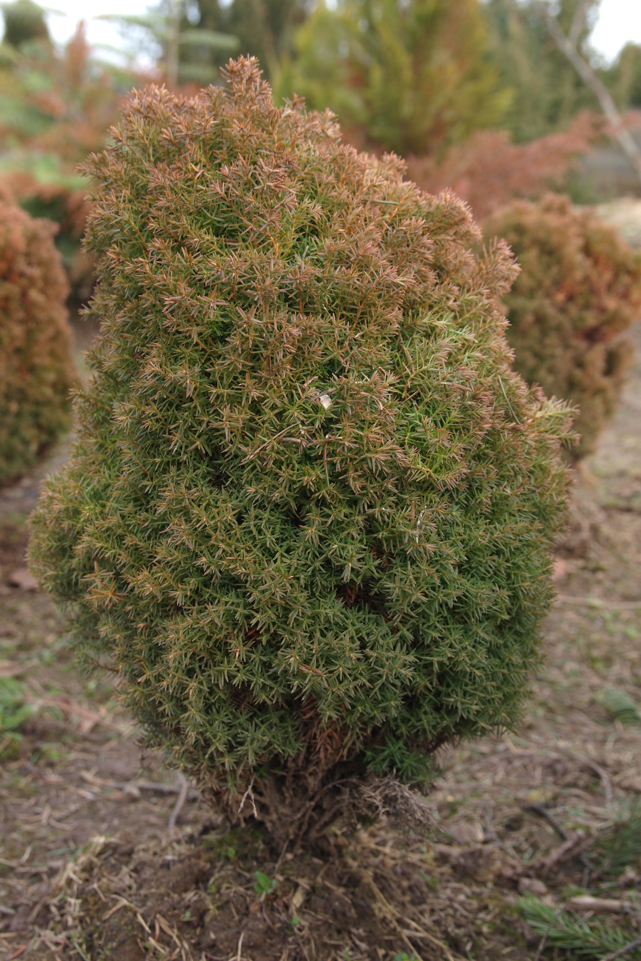 Morfoloģija. Mūžzaļš pundurkoks ar kompaktu, sākumā lodveida, vēlāk saplacinātu vainaga formu. Koka augstums 0,5-0,6m un platums 0,6-0,8m. Desmit gados izaug līdz 0,5m augstumā un platumā. Zarojums blīvs. Skujas mīkstas, sīkas, adatveida, pelēkzaļas vasarā, ziemā gali krāsojas bronzas krāsā.