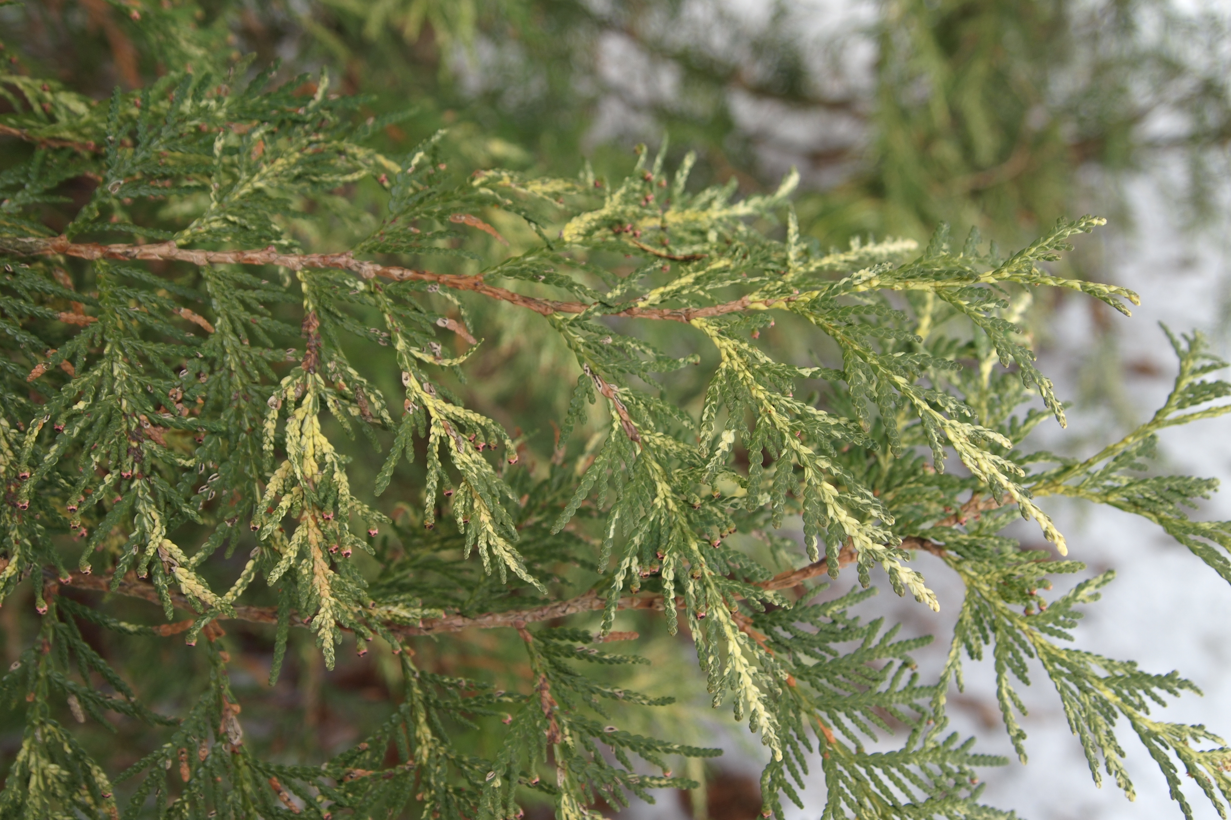 Morfoloģija. Mūžzaļš koks ar piramidālu vainagu. Koka augstums 3-5m un platums 1-2m. Zarojums diezgan skrajš, tomēr, pateicoties galos blīvi izvietotajiem sānu zariem, vainags nav tik irdens. Atšķirībā no pamatsugas zari izvietoti arī piezemes līmenī. Skujas zaļas ar bāli zeltainiem lāsumiem.