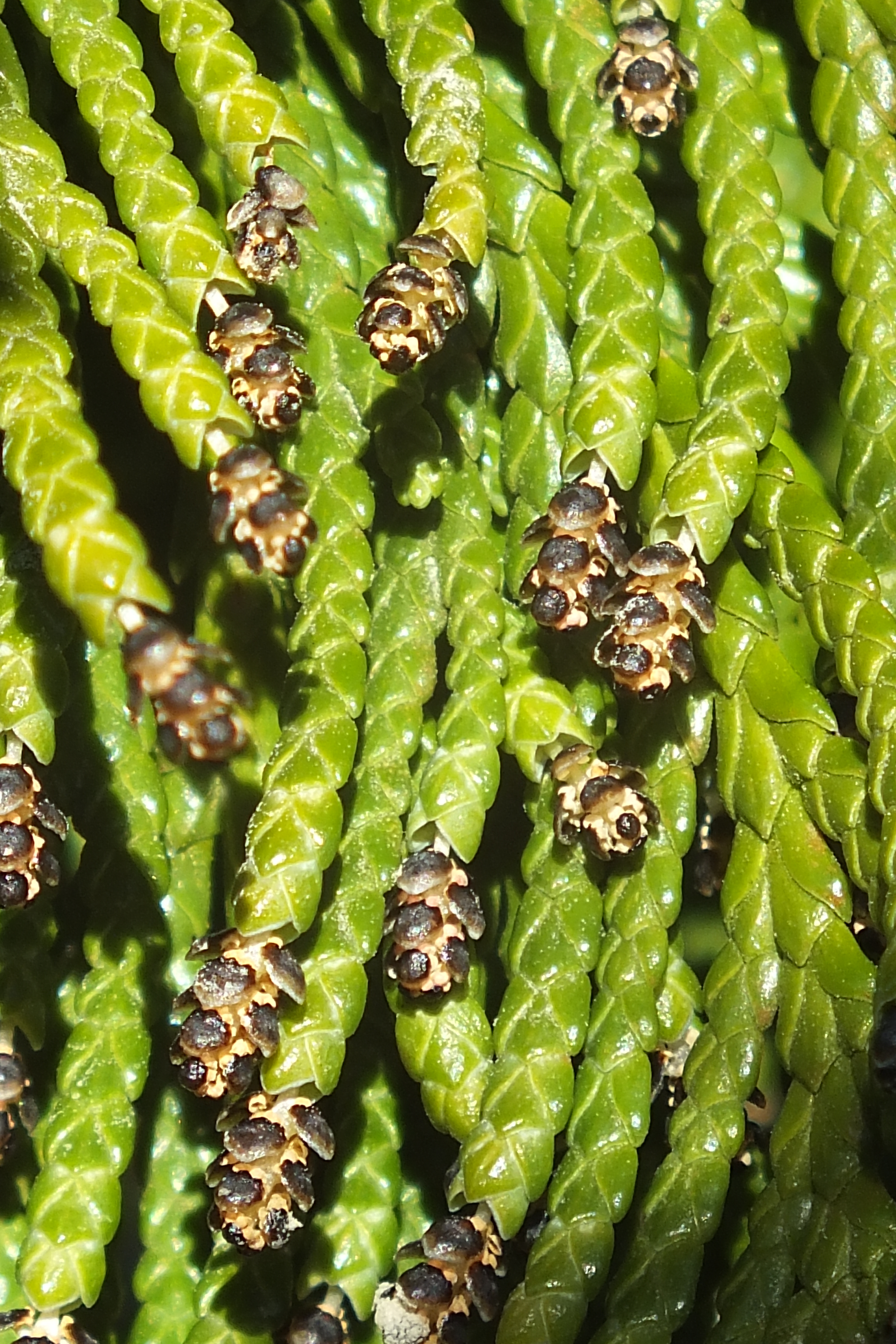 Morfoloģija. Mūžzaļš, vidēja lieluma koks ar plati piramidālu vainaga formu. Savvaļā koka augstums parasti sasniedz 18m, labos augšanas apstākļos un lielā vecumā arī virs 30m. Vainaga platums līdz 10m. Stumbra diametrs līdz 1m. Ilgmūžīgs koks, sasniedz 300 gadu vecumu. Miza plāna, vara krāsā, novecojot kļūst pelēkbrūna. Mehāniski ļoti izturīga koksne. Skeleta izplesti, lokveida. Sānu zari biezi, nokareni, saplacināti, no apakšas sudrabaini. Skuju plātnes platas. Skujas zvīņveida, 2-4mm garas, zaļas, matētas, apakšpusē ar baltām svītrām. Čiekuri ovāli, 6-12mm gari, sarkanbrūni.