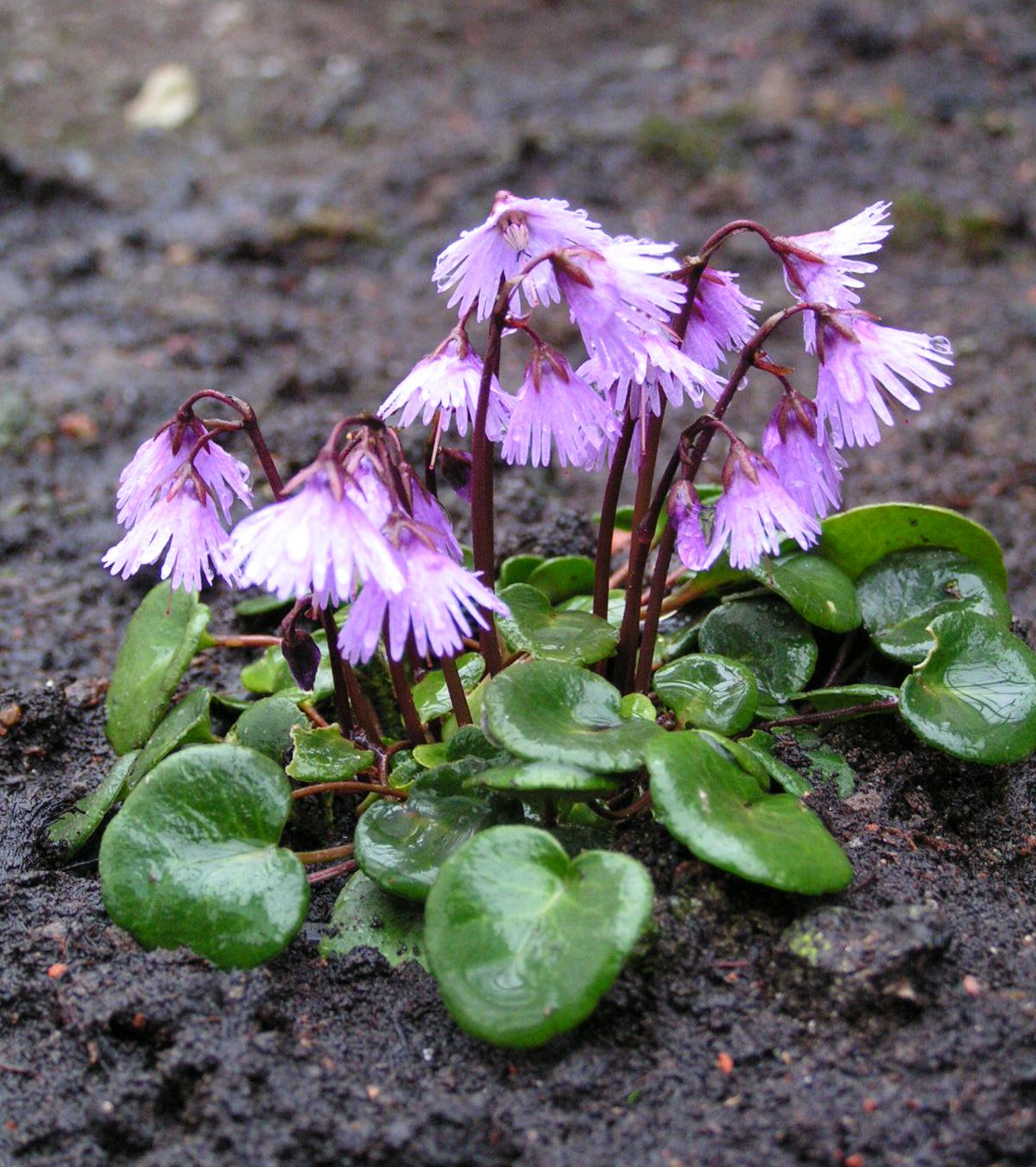 Karpatu soldanella (h 5 - 10cm) (Soldanella carpatica Vierh.) aug Karpatu kalnos. Ziedi violeti, šķelti, sakārtoti skrajā skarā.