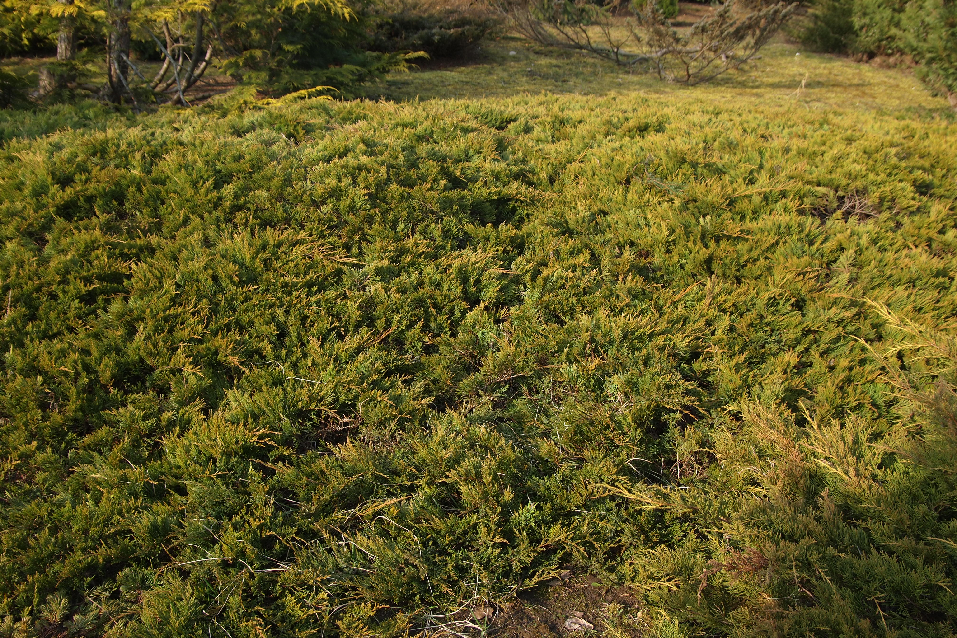 Morfoloģija. Zems, gandrīz klājenisks krūms. Vainaga augstums 0,3-0,5 m, platums 2,5-3 m. Miza sarkanbrūna, zvīņaina. Zari sākotnēji aug augšup, tad noliecas, tāpēc horizontālajam vainagam ir velvēta vidusdaļa. Dzinumi izplesti, stingri, dzinumu gali dakstiņveidā pārklājas. Skujas zvīņveida, sīkas, koši zaļas, aromātiskas. Čiekurogas neveido.