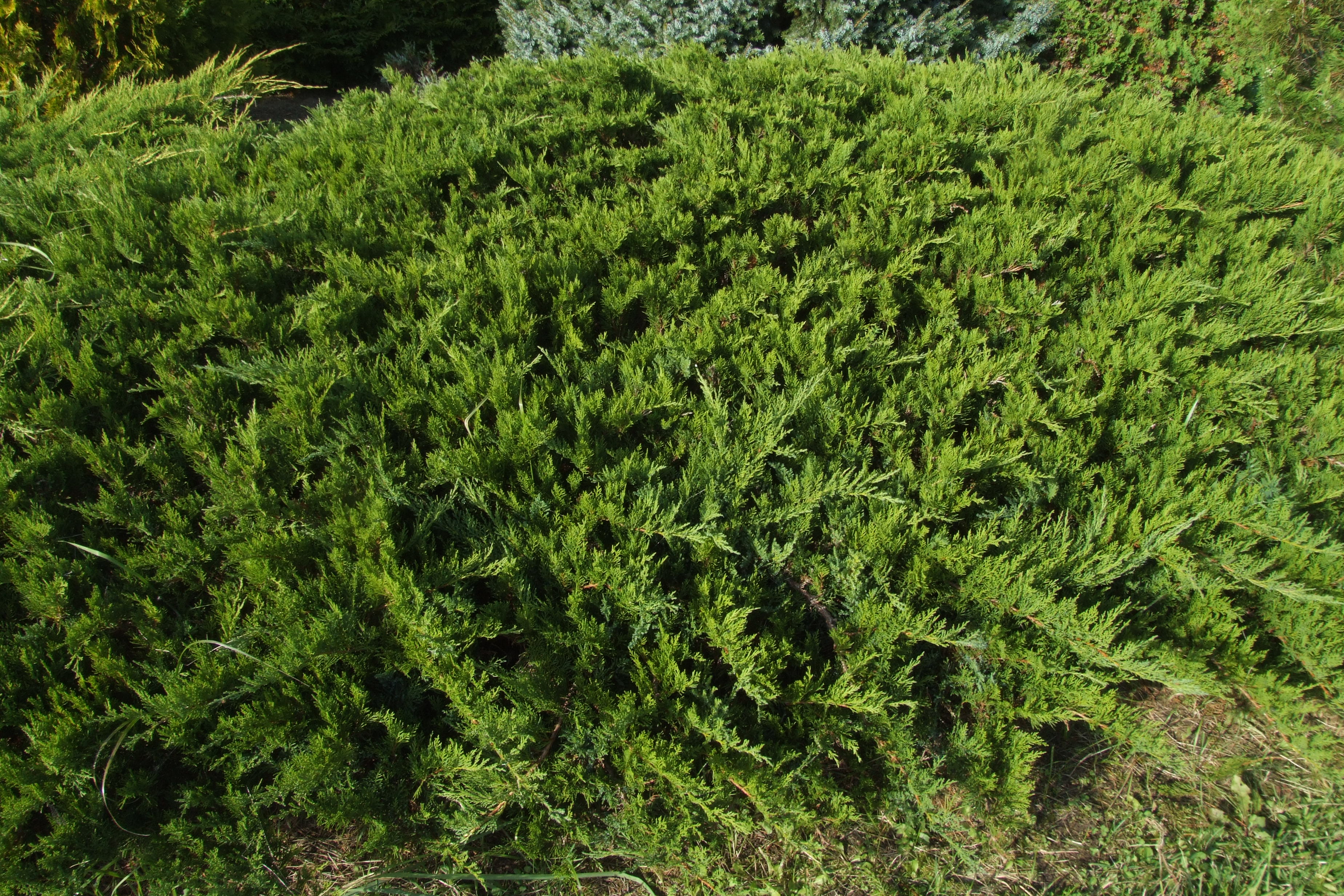 Morfoloģija. Klājenisks krūms ar dziļu sakņu sistēmu un izplestu, 0,8-1 m augstu un 1,5-2 m platu vainagu. Miza sarkanbrūna, zvīņaina. Dzinumi taisni, pacili. Skujas adatveida, sīkas (3-5 mm garas), nedaudz izliektas, vidēji asas, pelēkzaļā krāsā, aug blīvos mieturos pa trim. Dzinumu galos retumis sastopamas arī zvīņveida skujas. Divmāju augs. Apputeksnējas maijā, čiekurogas nobriest 18 mēnešu laikā; tās ir apaļas, 5-7 mm diametrā, ar kātiņu, tumši zilas, ar zilganu apsarmi. Visas auga daļas ir indīgas.