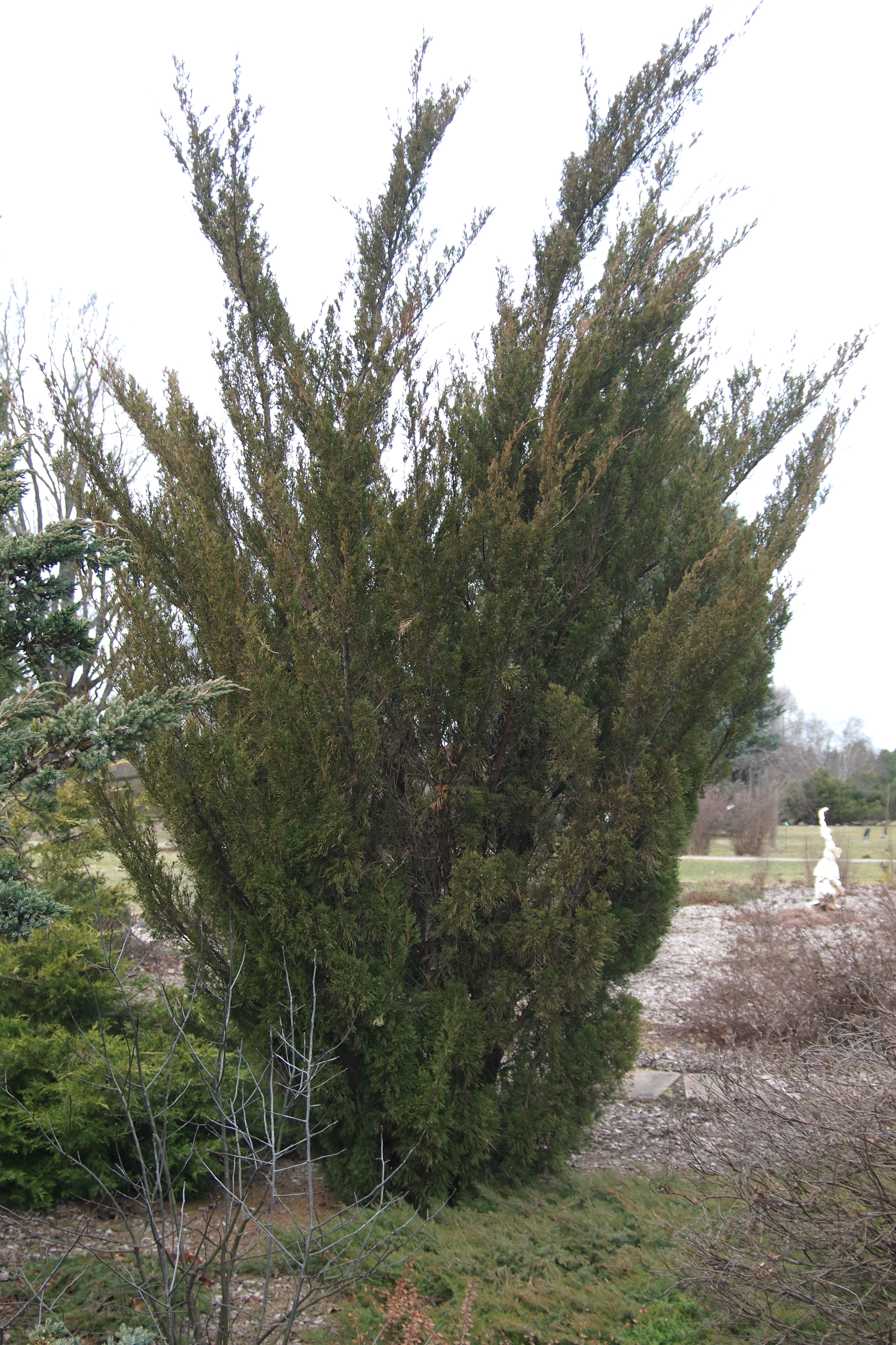 Morfoloģija. Plats krūms. Vainags parasti ap 1.5 m augsts un apmēram tikpat plats, taču var sasniegt arī ievērojami lielāku izmēru. Miza sarkanbrūna, zvīņaina. Zari plaši arkveidā izplesti, iekšpusē mazzaroti, dzinumi slaidi. Skujas pārsvarā adatveida, 3-5 mm garas, asas, gaiši zaļas; krāsa saglabājas arī ziemā.