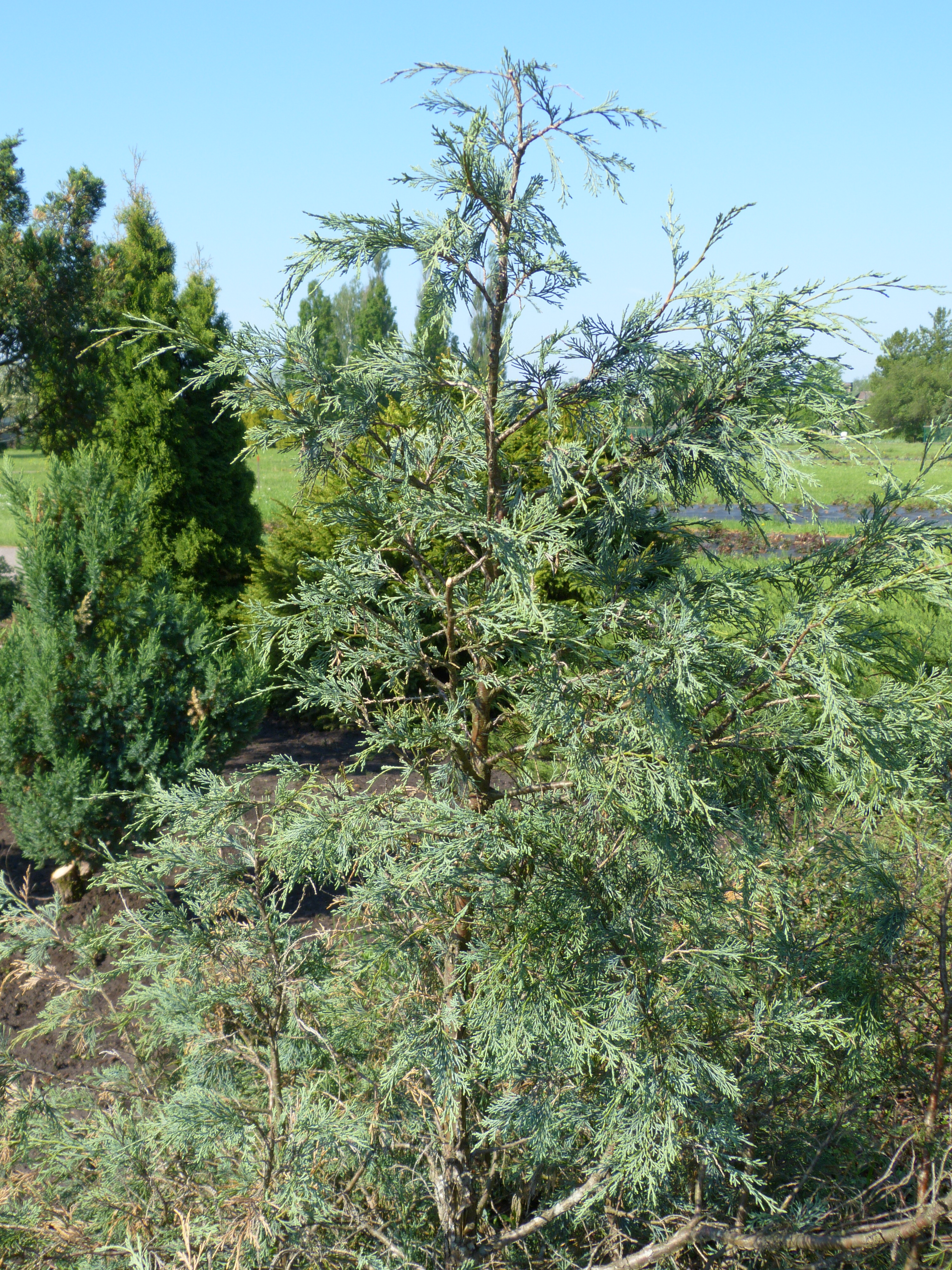 Morfoloģija. Koks ar vertikāli konisku, 3,5-4 m augstu un 0,8-1,2 m platu vainagu, kas kuplo no pašas zemes. Veciem augiem vainags var kļūt asimetrisks. Miza sarkanbrūna. Dzinumi gari, slaidi, gali atliekti, piešķirot vainagam īpaši dekoratīvu izskatu. Skujas smalkas, zvīņveida, sudrabaini zilganas, blīvi noklāj dzinumus. Čiekurogas sīkas, lodveida, 5-7 mm diametrā, tumši zilas ar zilganu apsarmi.
