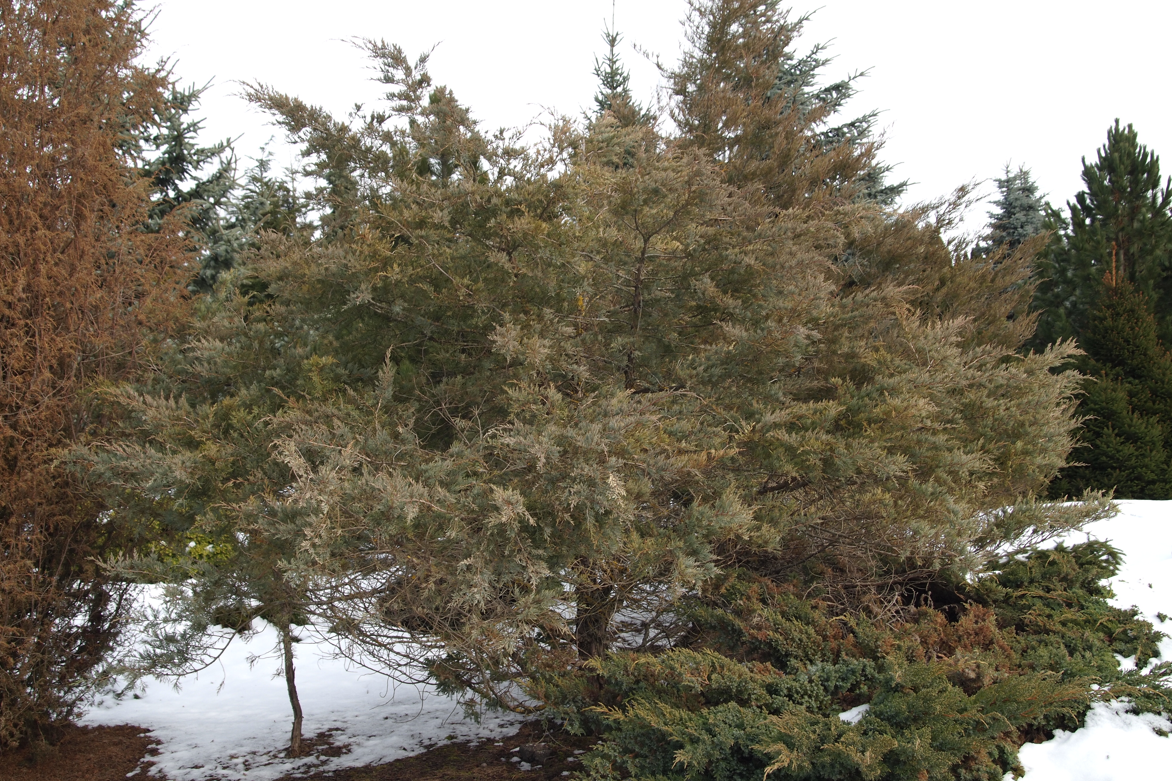 Morfoloģija. Neliels koks. Vainags kolonveida, līdz 5 m augsts, 2-4 m plats, blīvi zarots, kuplo no pašas zemes. Miza pelēkbrūna, plēkšņaina. Dzinumi slaidi, apaļi. Skujas pelēkzilā krāsā, sīkas, zvīņveida, bet uz dzinumiem auga iekšpusē – arī adatveida. Čiekurogas tumši zilas ar gaišzilu apsarmi.