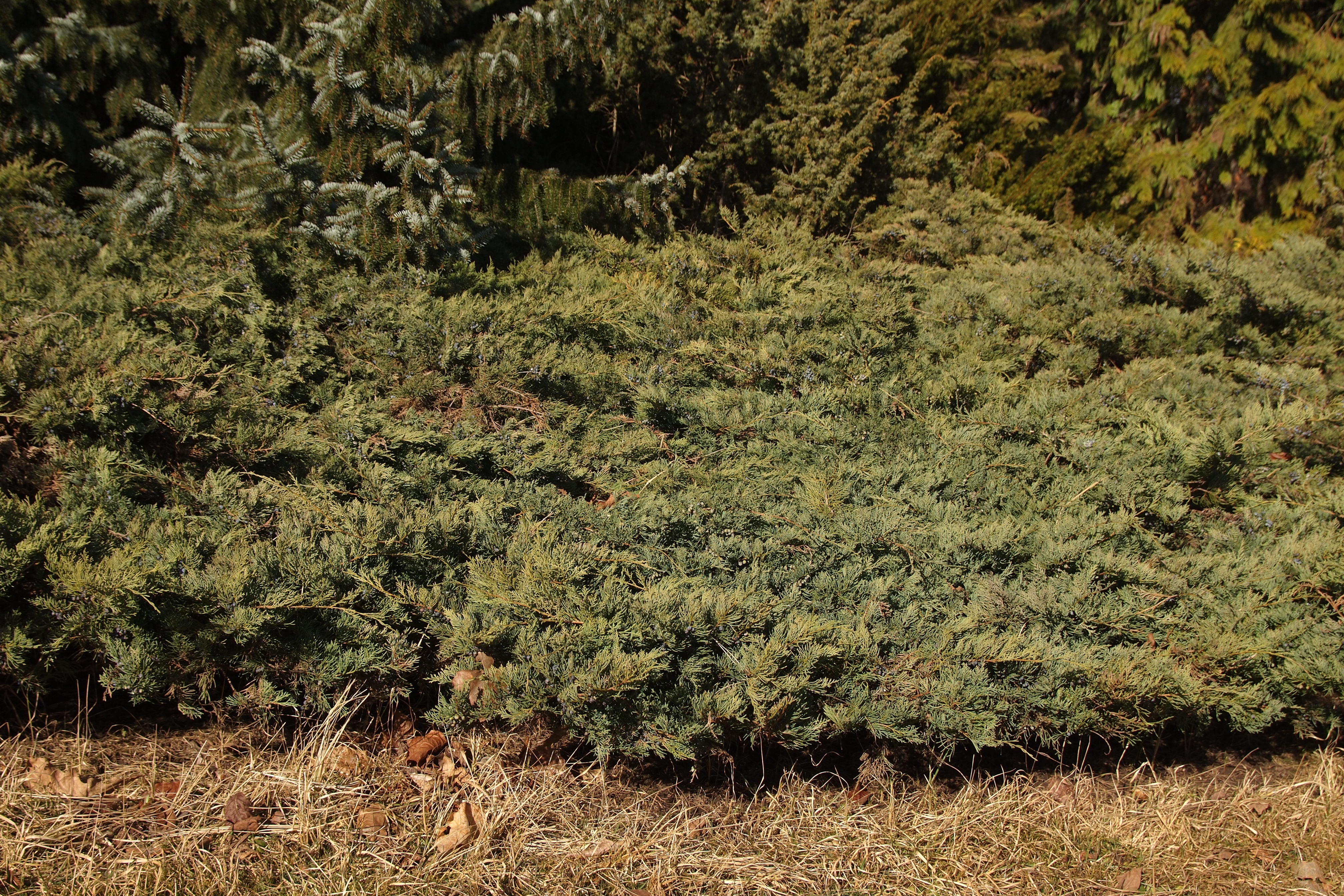 Morfoloģija. Zems, plati augošs krūms ar neregulāri izplestu, 1-2 m augstu un 2-3 m platu vainagu. Miza pelēkbrūna, plēkšņaina. Zari pacili, dzinumi slaidi, to gali pārkareni. Skujas sīkas, mīkstas, piekļautas dzinumiem. Tās ir pelēcīgi zilganzaļā krāsā, ziemā iegūst brūnganu purpura toni. Šķirne ir sievišķais klons, piemērota apputeksnētāja klātbūtnē tā bagātīgi veido tumši zilas čiekurogas ar gaišzilu apsarmi.