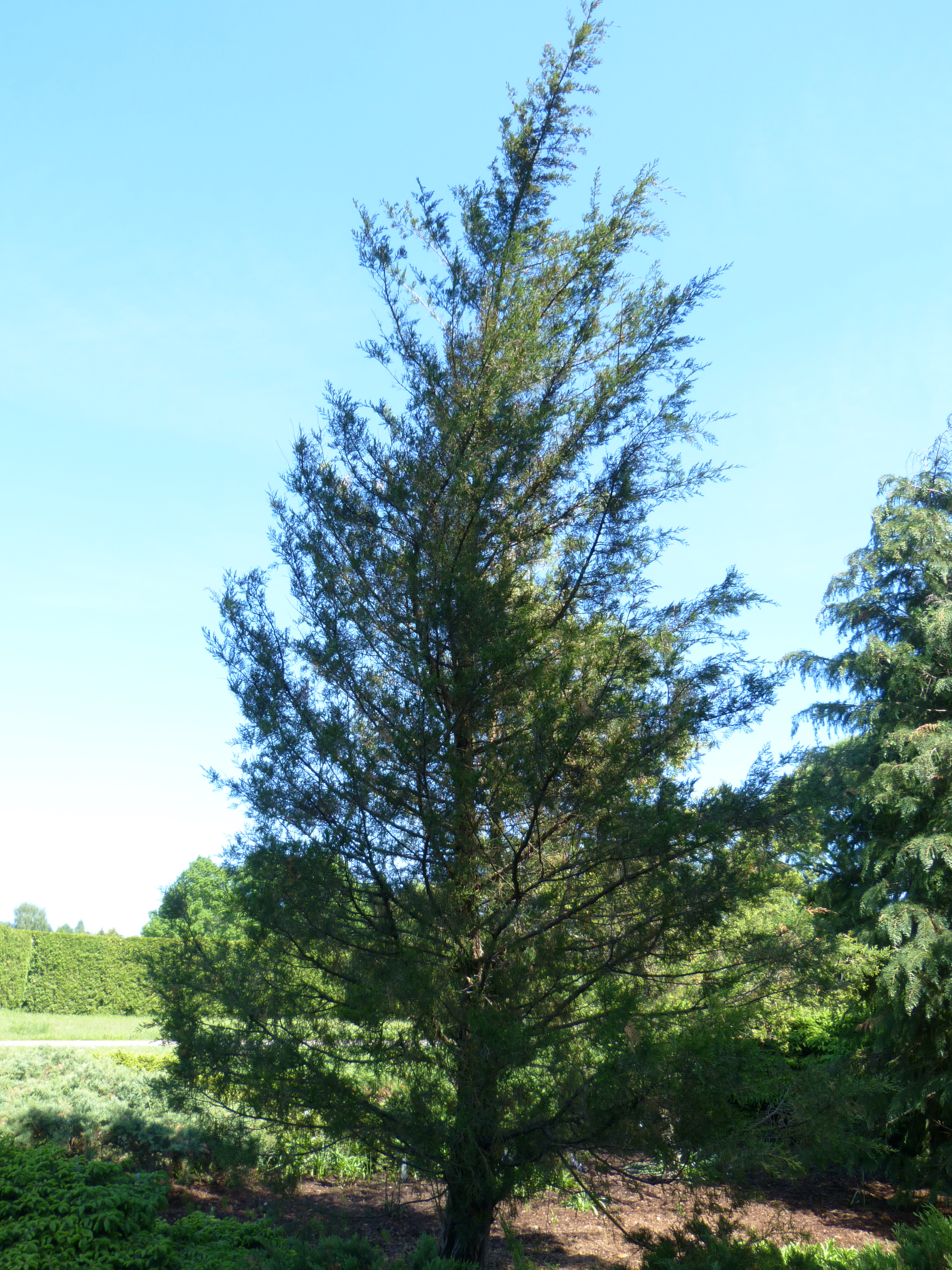 Morfoloģija. Neliels koks. Vainags stāvs, ķegļa formā, 2-3 m augsts, ap 1,2 m plats. Miza pelēkbrūna, plēkšņaina. Zari aug augšup. Dzinumi slaidi, četršķautņaini. Skujas zvīņveida, cieši pieguļ dzinumiem, koši zaļas, ziemā – rūsganas. Čiekurogas lodveida, tumši zilas ar gaišzilu apsarmi.