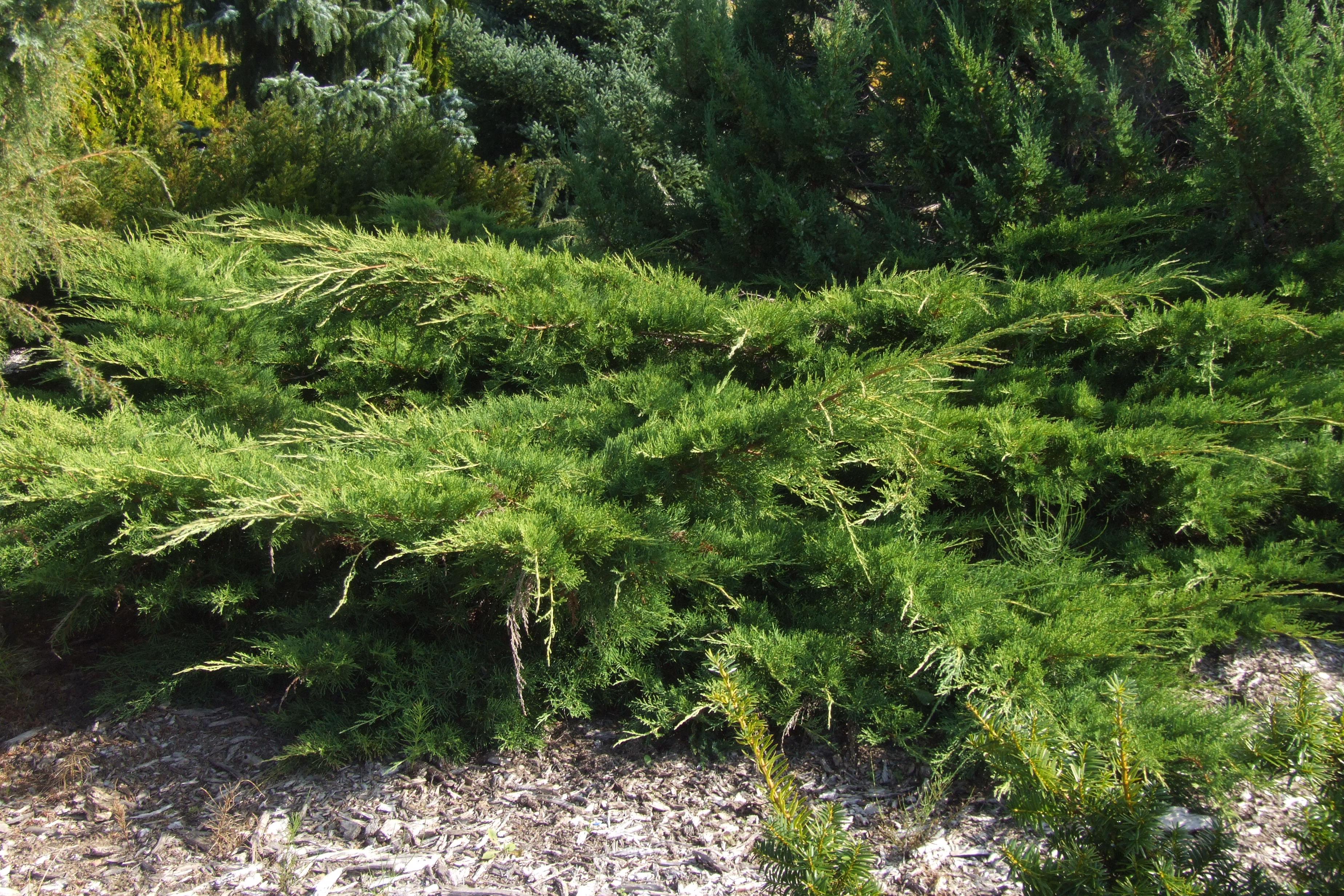 Morfoloģija. Zems, izplests krūms. Vainags ap 1,2 m augsts un 3-4 m plats. Miza pelēka, raupja. Zari pacili, dzinumu gali nokareni. Skujas zvīņveida, gaiši zaļas, saulainā vietā dzinumu galos dzeltenas, ziemā krāsojas rūsganas. Čiekurogas nelielas, tumši zilas ar bālganu apsarmi.