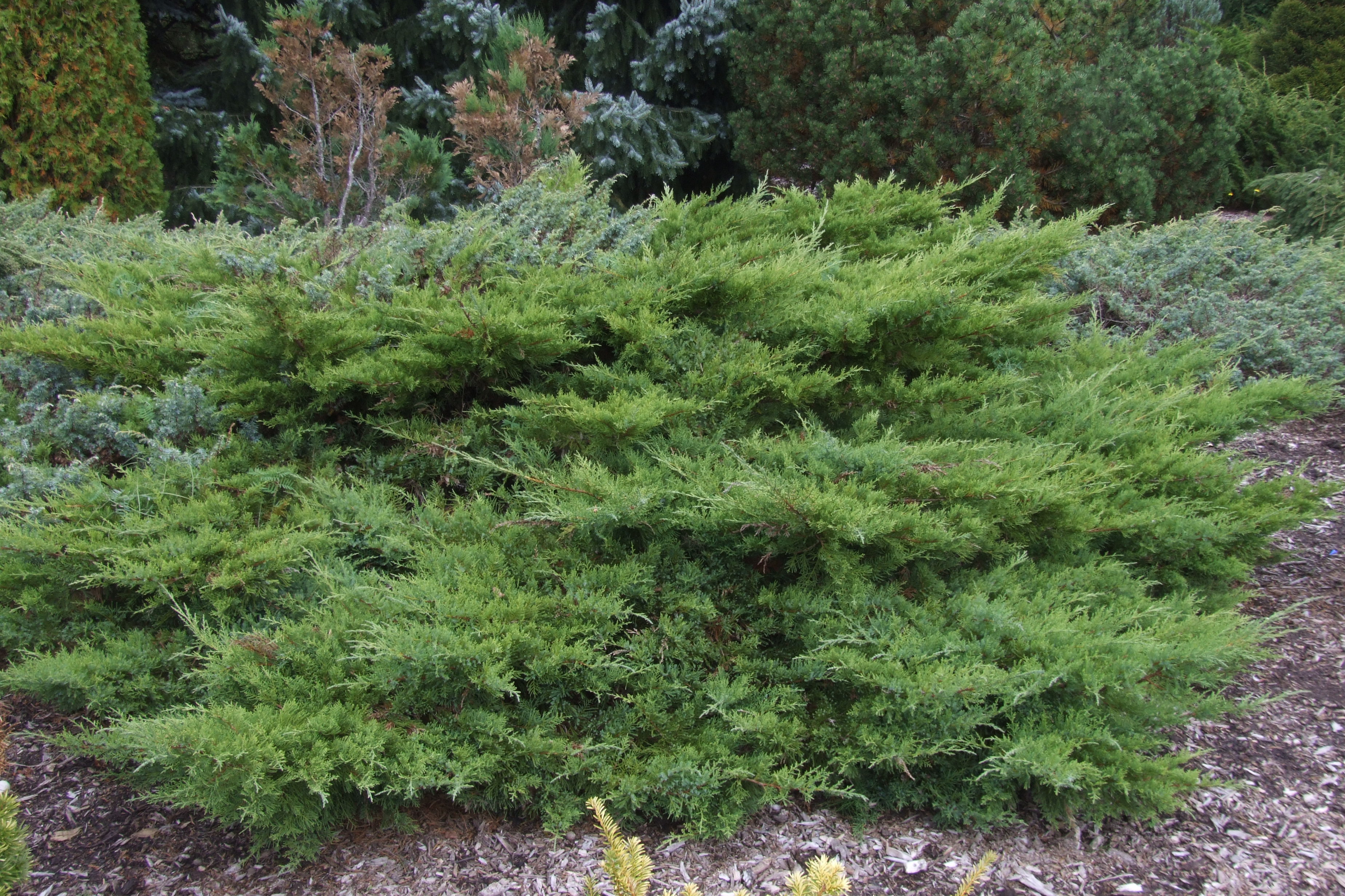 Izcelsme. Sinonīms Juniperus x media ‘Pfitzeriana Glauca’. Viena no kultūrā radušās Ķīnas kadiķa un kazaku kadiķa hibrīdu grupas šķirnēm. Ieviesta ASV Teksasas štata Šermenas stādaudzētavā „Texas Co”.