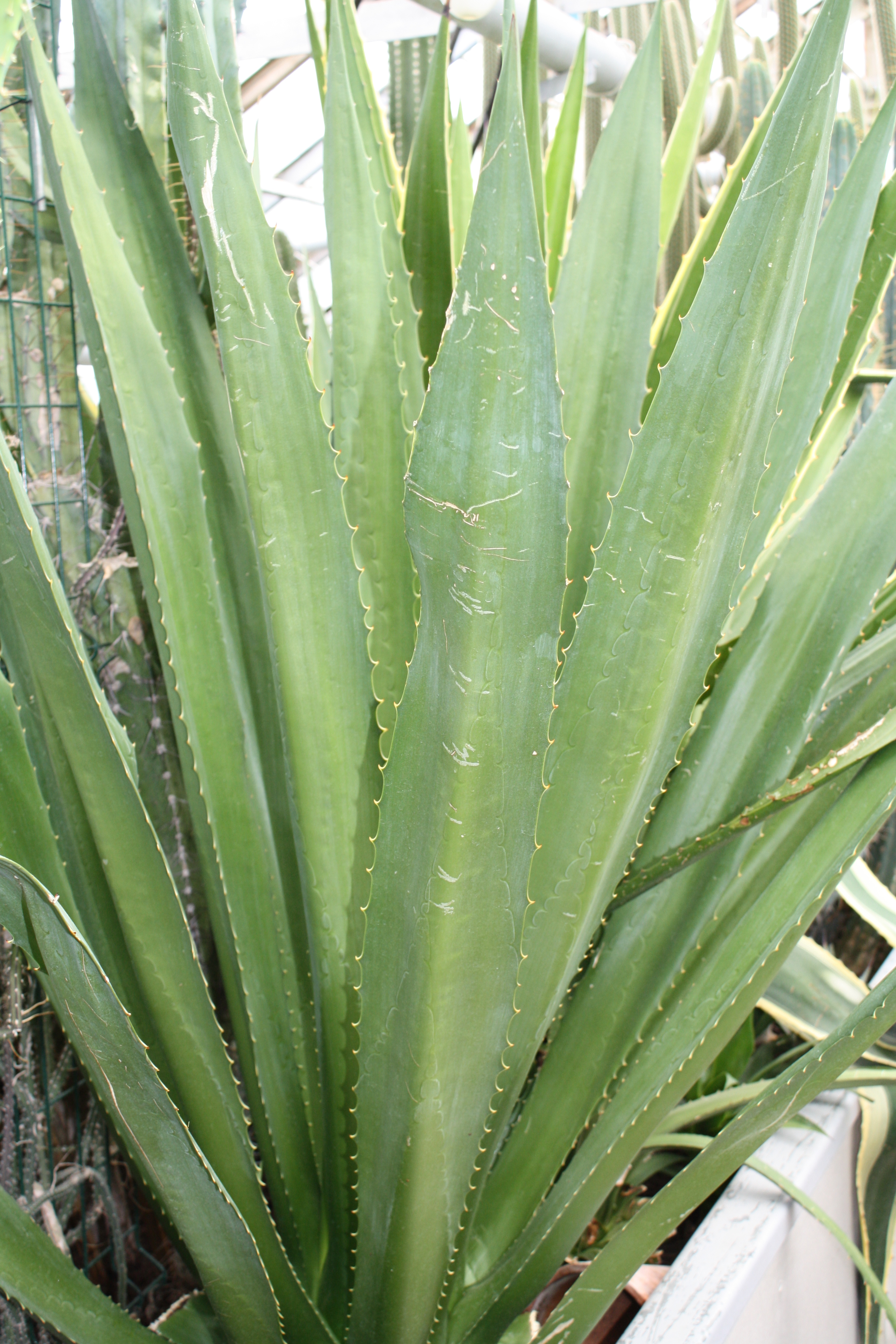 Morfoloģija. Daudzgadīgs, mūžzaļš lapu sukulents, kurš ar gadiem izveido īsu stumbru. Gaiši zaļās lapas 70-120 cm garas, zobenveida ar dzelkšņiem gar malām. Lapu gals atliecies, ar nelielu smailu izaugumu galā. Blīvi izvietotās lapas veido simetrisku rozeti. Sakņu sistēma plaša, spēcīga un dziļa. Ļoti reti pie sakņu kakla attīstās jaunie dzinumi. Telpās nezied.