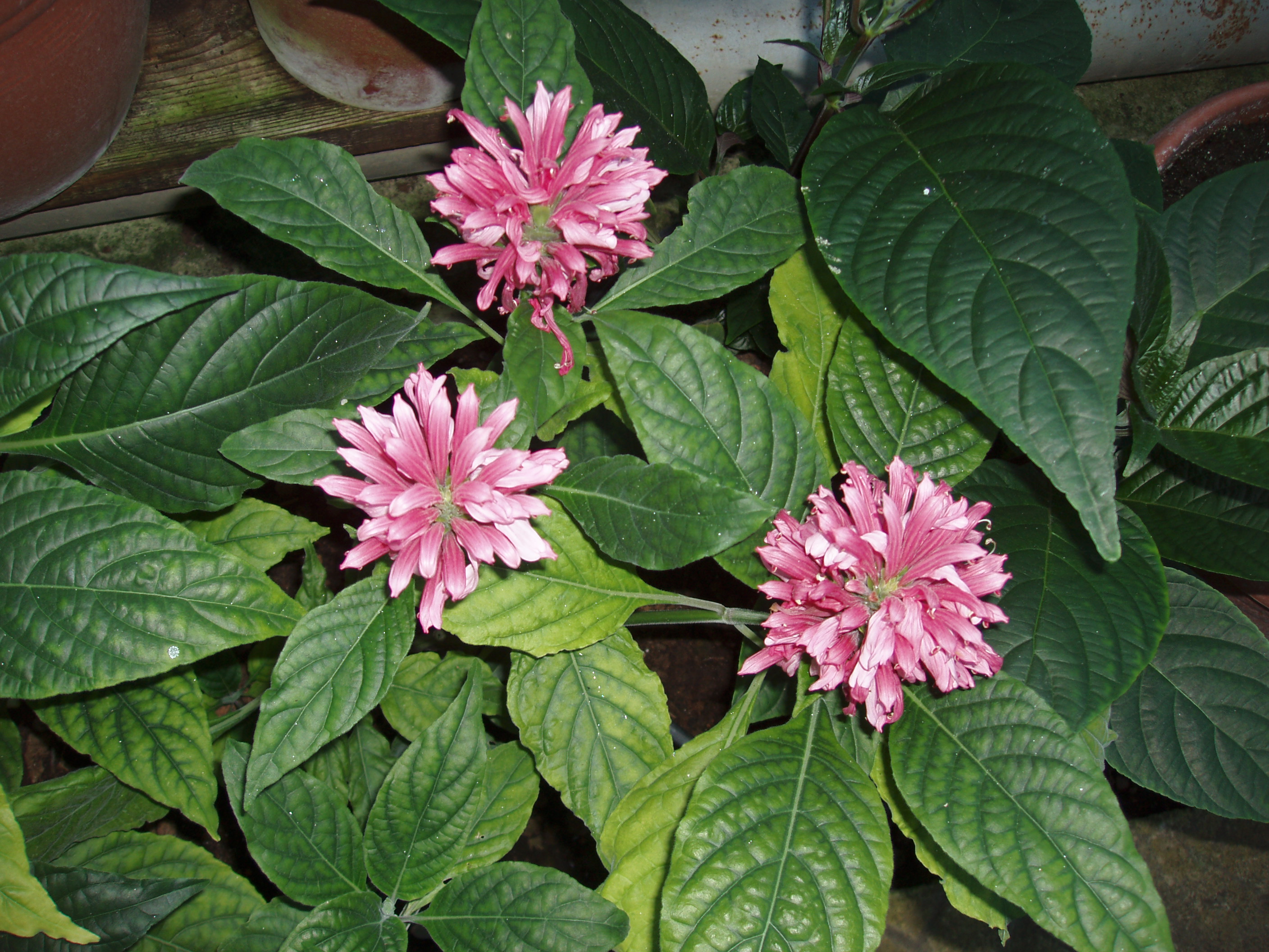 Morfoloģija. Daudzgadīgs, mūžzaļš, līdz 1,5 metrus augsts un kupls krūms. Platas, tumši zaļas līdz pelēkzaļas, pagaras, eliptiskas lapas. Vecie stumbri, zari ar gadiem pārkoksnējas, paliek bez lapām. Stingri, uz augšu, taisni stāvošas ziedkopas ar spilgti sarkanām vai rozā seglapām un baltiem ziediem. Seglapas ilgāk saglabā krāsojumu un ilgāk paliek pie auga nekā ziedi, kuri pēc noziedēšanas- sakalst un nobirst. Zied no maija līdz septembrim.