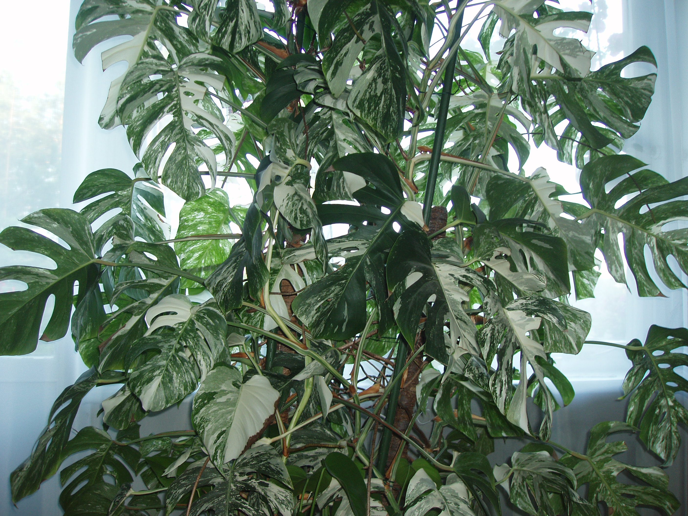 Morfoloģija. Mūžzaļš, daudzgadīgs liānveida lakstaugs ar nedaudz un dziļi šķeltām, 20-25 cm garām un 16-18 cm platām, gaiši zaļām, gludām, spīdīgām lapām, kurās ir daudz dzeltenbaltu, neregulāru plankumu, lāsumu un svītru. Telpās izaug 2-4 m garumā. Daudz garu gaisa sakņu, kuras palīdz uzņemt gaisa mitrumu, daļa no tām kalpo kā balstsaknes. Lapas kāts ar maksti, kurš apņem stumbru. Spēcīga, gara sakņu sistēma. Reti zied.