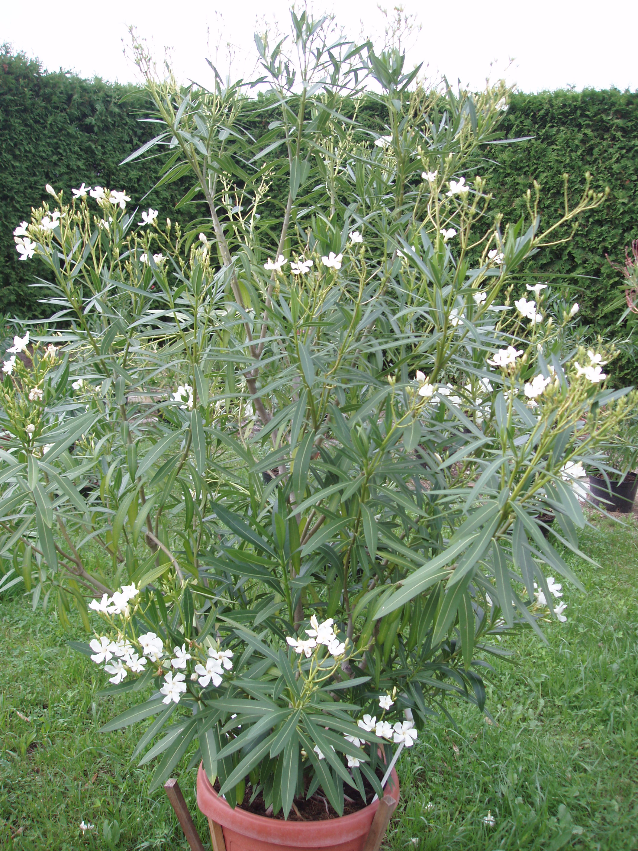 Morfoloģija. Daudzgadīgs, mūžzaļš, 2-3 metrus augsts krūms ar 10-15 cm ādainām, lancetiskām, zaļām lapām, saliktas pa 3-4 mietturos. Lapas apakšpuse gaišāk zaļa nekā virspuse. Miza gluda. Sakņu sistēma bagātīga un spēcīga. Zari viegli noliekti. Ziedi smaržīgi, klaji vai pildīti, rozā vai balti. Ziedi zaru galos, sakārtoti pagaros čemuros.