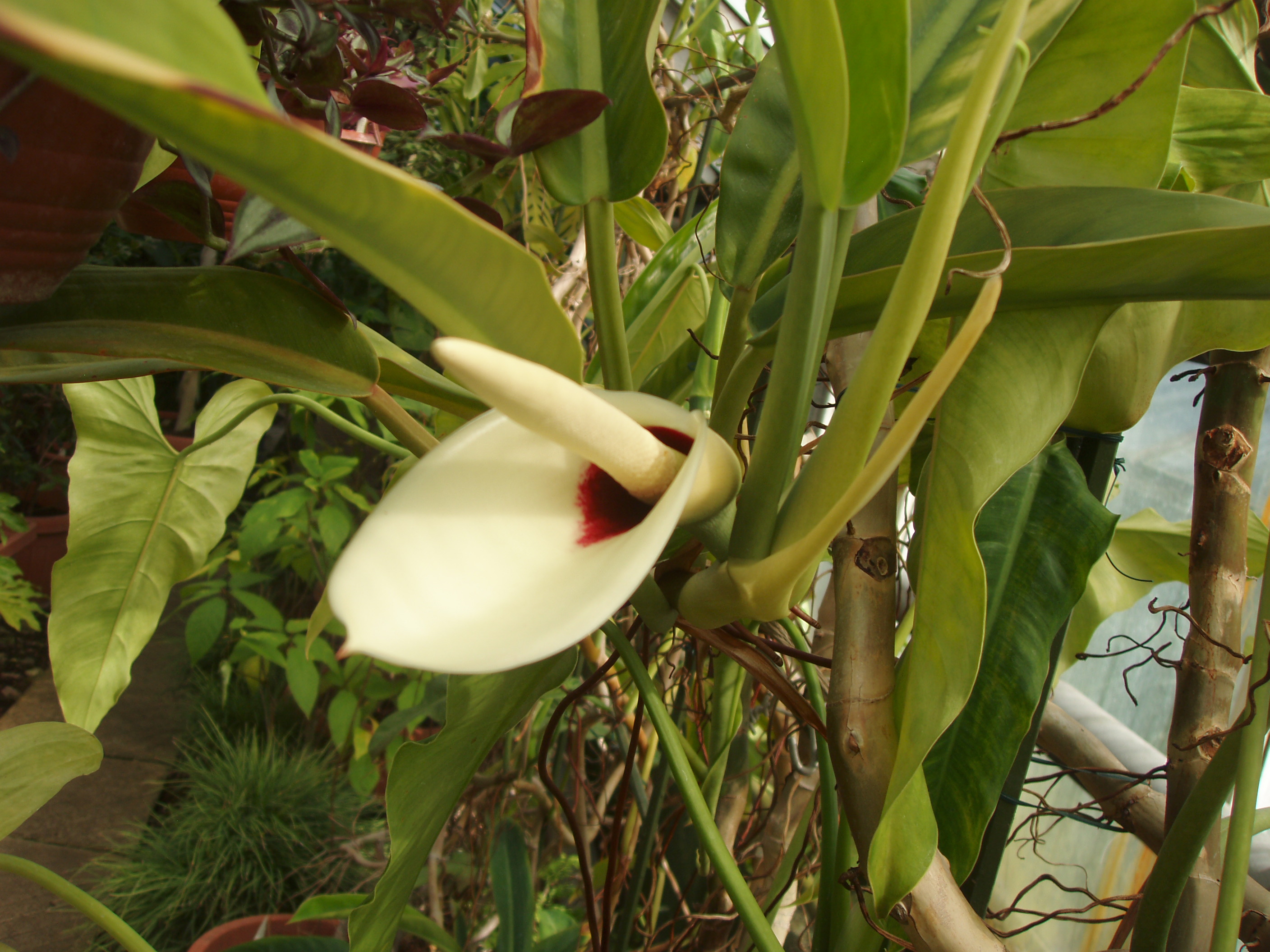 Morfoloģija. Daudzgadīgs, mūžzaļš, 2-3 m garš, liānveida lakstaugs ar garām 20-30 cm, 6-8 cm platām, ādainām, gludām, tumši zaļām lapām. Lapas uz pagariem kātiem. Saknes spēcīgas, garas. Zied katru gadu, agri pavasarī. Seglapa baltā krāsā, iekšpuse apkārt zieda vālītei dzeltena. Uz stumbra, zem lapu mezgla veidojas īsas gaisa saknes.
