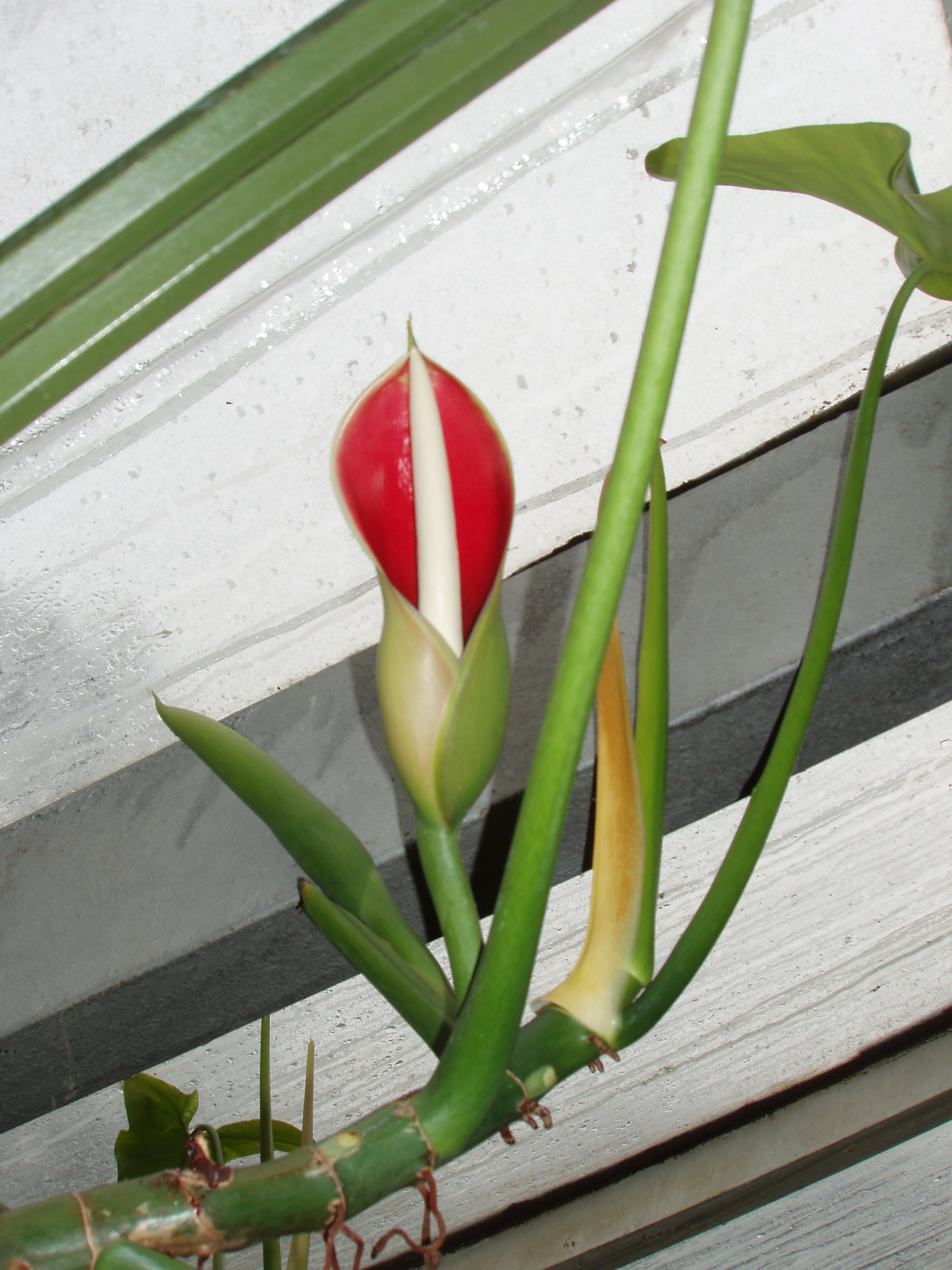 Morfoloģija. Daudzgadīgs, mūžzaļš 2-4 metrus garš, liānveida lakstaugs ar gaiši zaļām, vijoļveida lapām 20-30 cm garumā. Lapas uz gara kāta. Zem lapas mezgla, uz stumbra veidojas vairākas, īsas gaisa saknes. Saknes garas, spēcīgas. Zied pavasarī ar vālītē sakārtotiem dzelteniem ziediem. Seglapa balta, iekšpusē sarkanīga. Telpā augiem sēklas nenogatavojas.