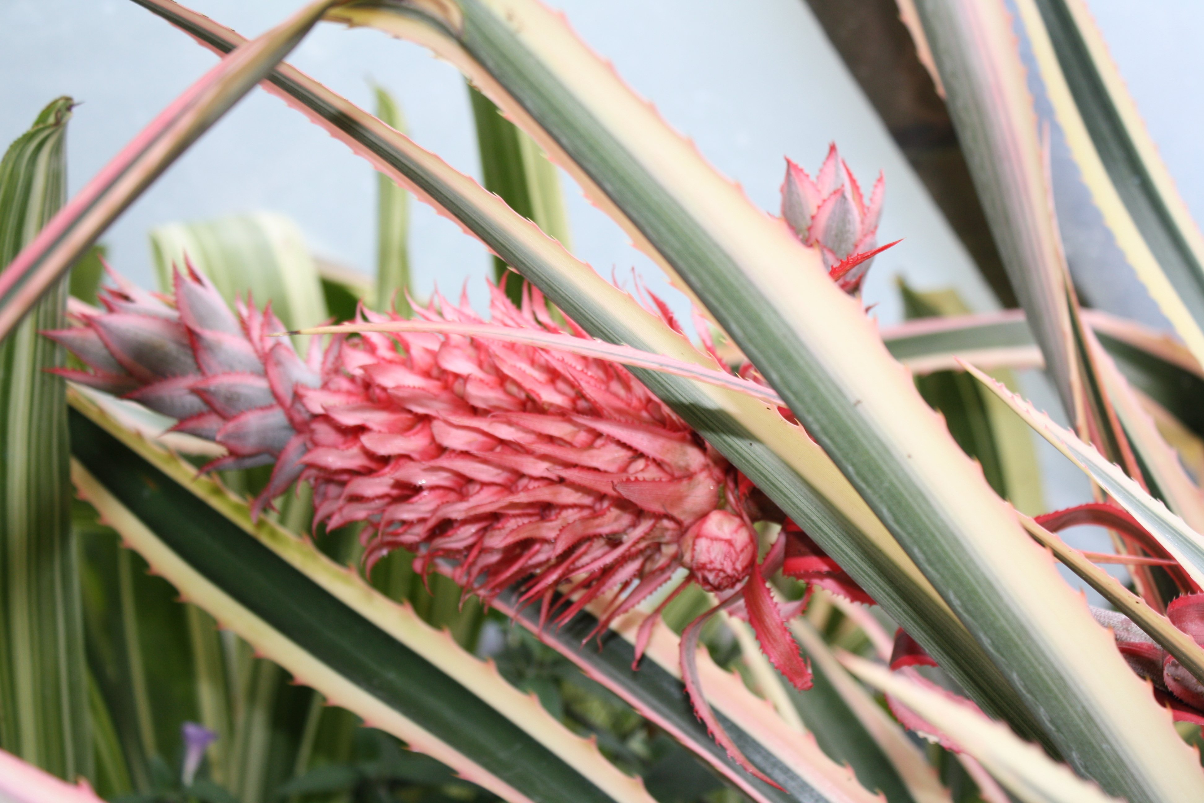Morfoloģija. Mūžzaļajam, daudzgadīgajam lakstaugam lapu rozete telpā izaug 1-1,5 metrus gara. Lapas izvietota simetriski, tās ir cietas, kuras malas klāj dzeloņi. Gar lapu malām dzeltenbaltas garensvītras, kuras malās vēl iekrāsojas rozā krāsā. Zied pavasarī, vasarā un rudenī. Čiekurveida ziedkopā, kurai galā ir neliels lapu pušķis, noziedot ziediņiem attīstās sulīgi mazi auglīši, kuri saaugot kopā veido ēdamu ananāsa augli.
