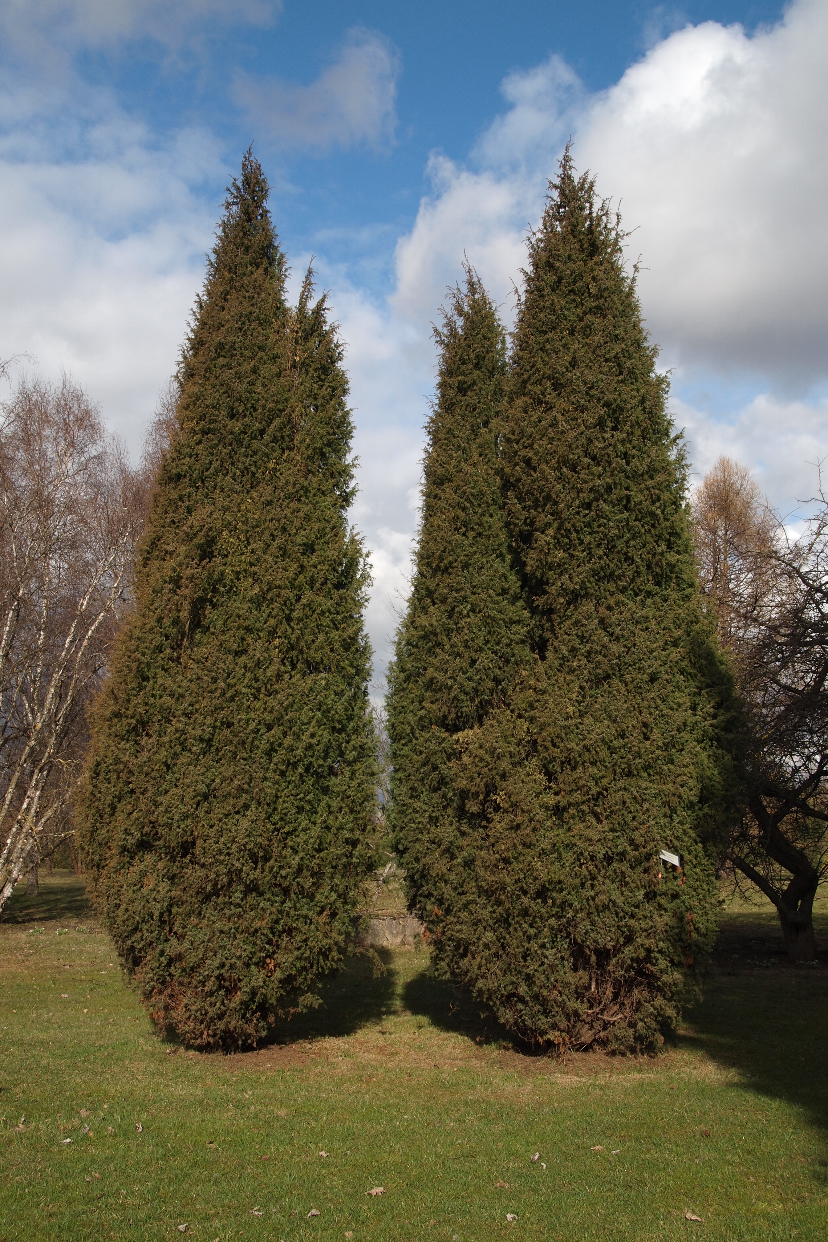 Morfoloģija. Neliels koks vai krūms, kas sasniedz 4-8 m augstumu. Vainags šauri piramidāls vai kolonveida. Stumbrs stāvs, dzinumi taisni, to galotnes atliektas. Miza pelēka. Skujas adatveida, mieturos pa trim, 10-15 mm garas, asas. To virspuse iedobta, ar zilganu atvārsnīšu joslām, apakšpuse zilganzaļa. Divmāju augs. Vīrišķie strobili pavasarī izplata dzeltenus ziedputekšņus. Uz sievišķajiem augiem veidojas čiekurogas 5-7 mm diametrā, kas nobriest 18 mēnešu laikā, kļūstot tumši zilas.