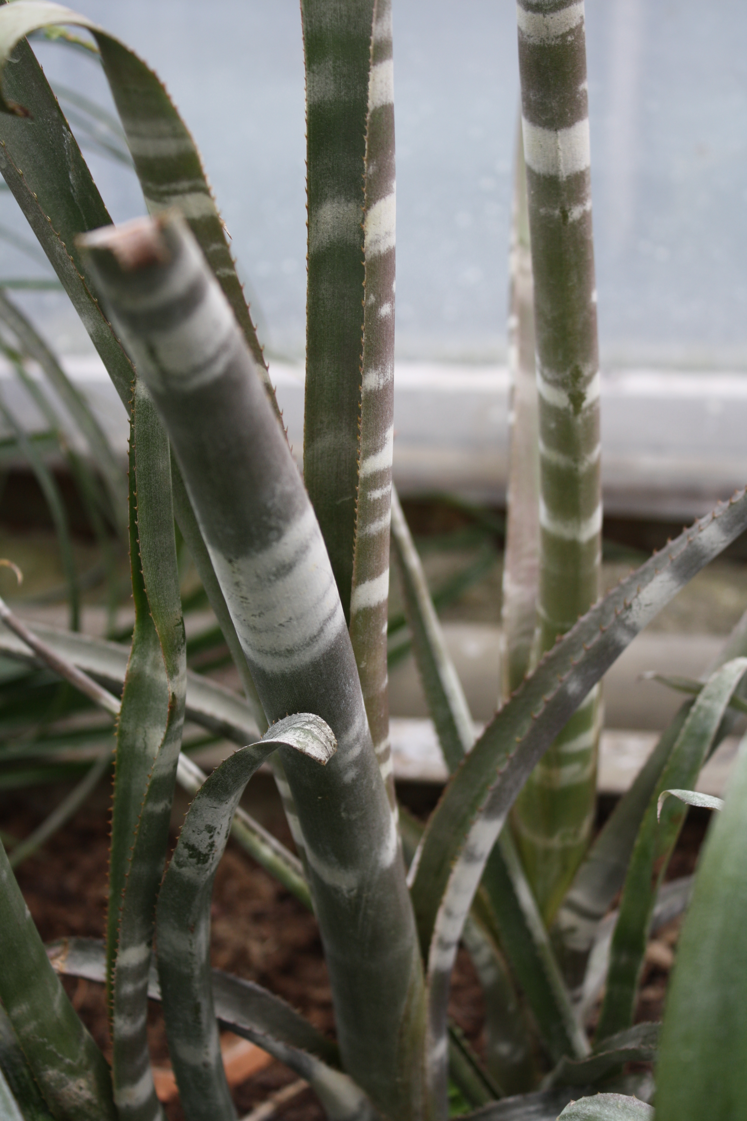 Morfoloģija. Mūžzaļš, daudzgadīgs bezstumbra lakstaugs ar stingru, vertikālu lapu rozeti. Lapas pelēkzaļas ar baltpelēkām šķērssvītrām, malas nedaudz ierullētas, cietas, ar sīkiem dzeloņiem malās. Rozetes vidū attīstās gara vārpveida ziedkopa – ar spilgti rozā braktejām un koši ziliem, nokareniem ziediem. Zied ziemā, pavasarī. Sakne maza.