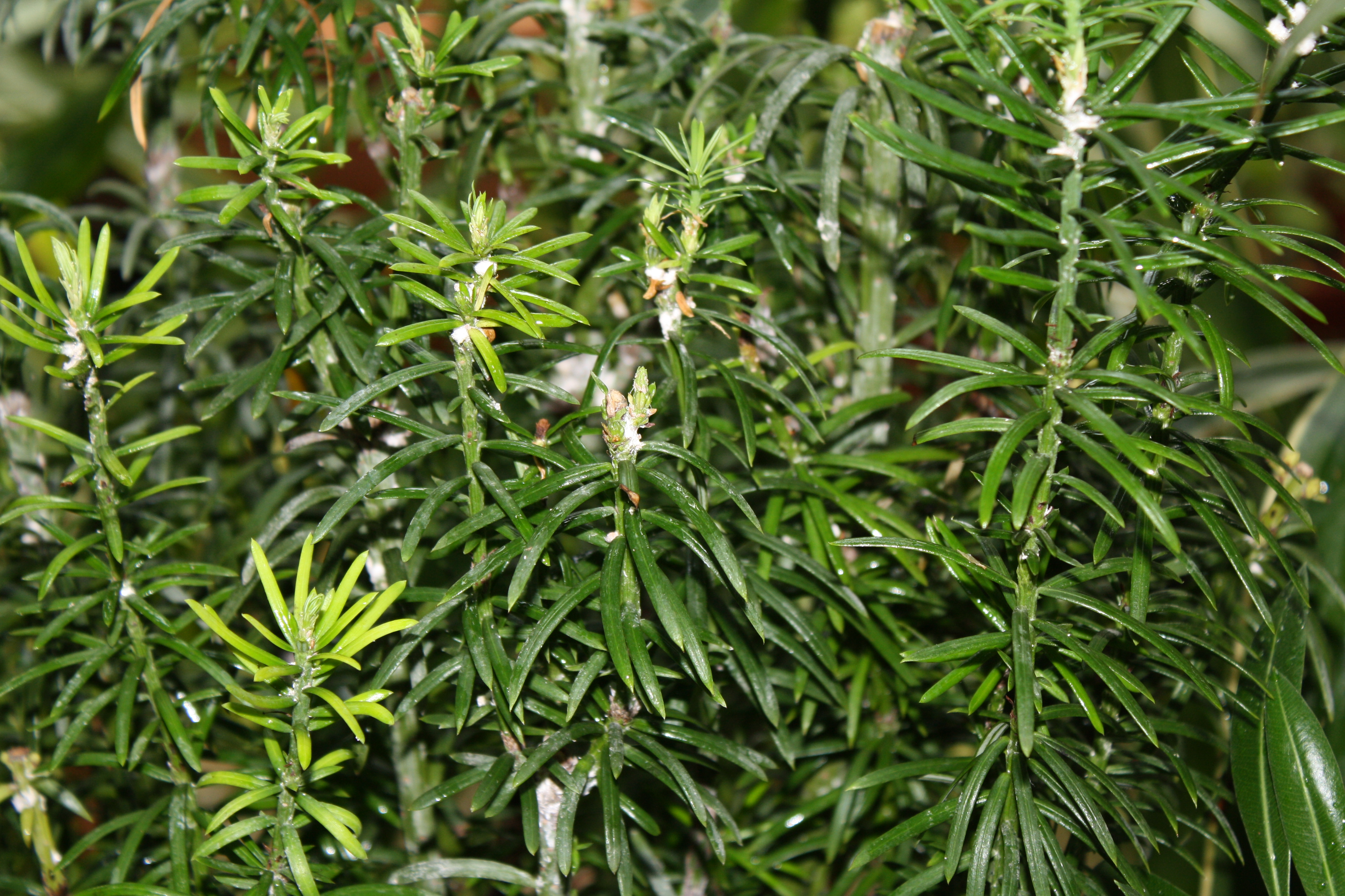 Morfoloģija. Mūžzaļš, daudzgadīgs, daudzzarains, tumši zaļu, plakanu, īsu skuju krūms, retāk koks. Telpās var izaugt 2 metru garumā. Stāvie dzinumi pie stumbra apakšas atstāvoši. Sakne spēcīga un dziļa.