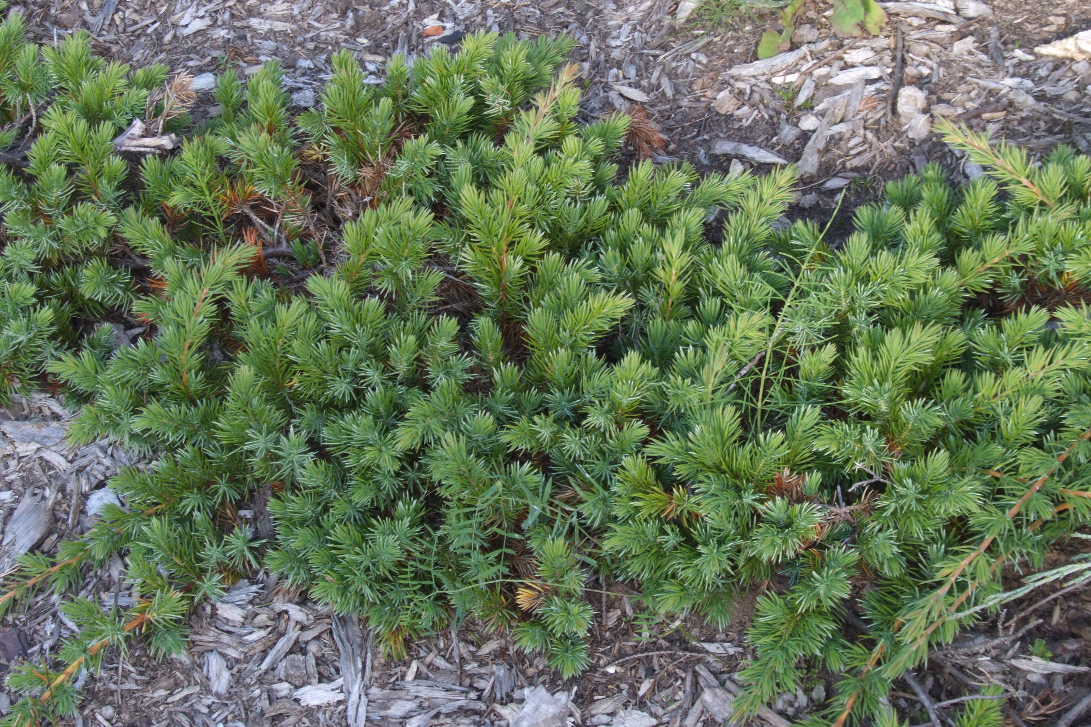 Morfoloģija. Klājenisks, blīvs krūms ar ložņājošiem zariem. Dzinumu gali pacili. Vainaga augstums 0,5 m, dzinumi var noklāt līdz 3 m2 laukumu. Miza brūna vai sarkanbrūna, zvīņaina. Skujas ļoti asas, lancetveida, mieturos pa trim, 8-15 mm garas, 1-1,7 mm platas, taisnas vai pie pamatnes viegli ieliektas, zilganzaļas, ar bālu atvārsnīšu joslu iekšpusē. Dzinumu galotnēs mieturi satuvināti, skujas ļoti blīvi. Divmāju augs, apputeksnējas maijā. Čiekurogas lielas, 8-14 mm diametrā, apaļas vai olveida, zili melnā krāsā ar zilganu apsarmi. Katrā auglī 3 sēklas.