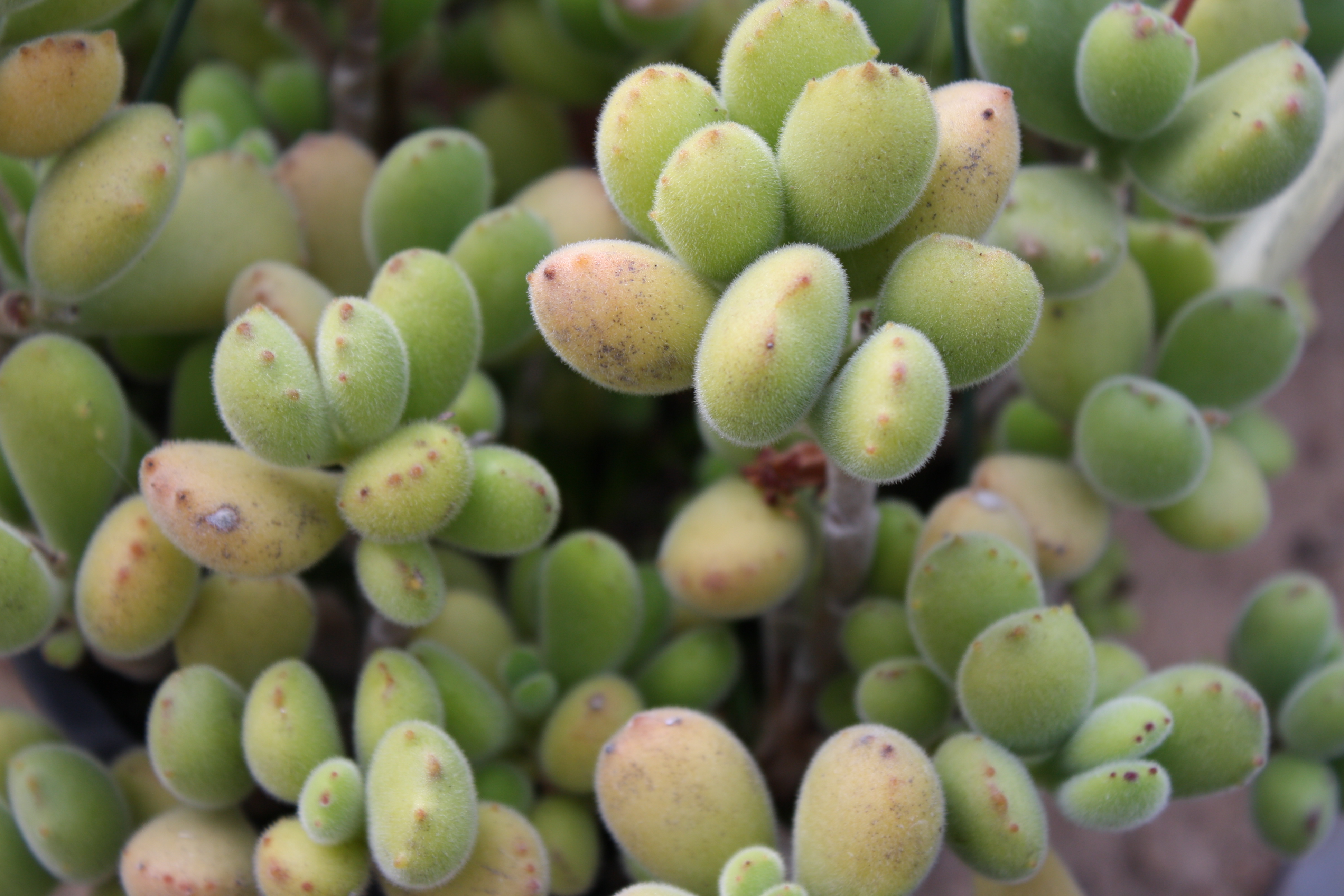Morfoloģija. Mūžzaļš, daudzgadīgs sukulents, kurš veido daudzzarainu 20 cm augstu krūmiņu. Biezās, nelielās lapas gaiši zaļās, klātas ar smalku pūku. Lapas malas iekrāsojas rozā krāsā un ir zobainas. Lapas pie stumbra sakārtotas pa pāriem. Ziedi zvanveida, oranži, uz pagara ziedkāta, dzinuma galotnē. Zied pavasarī.